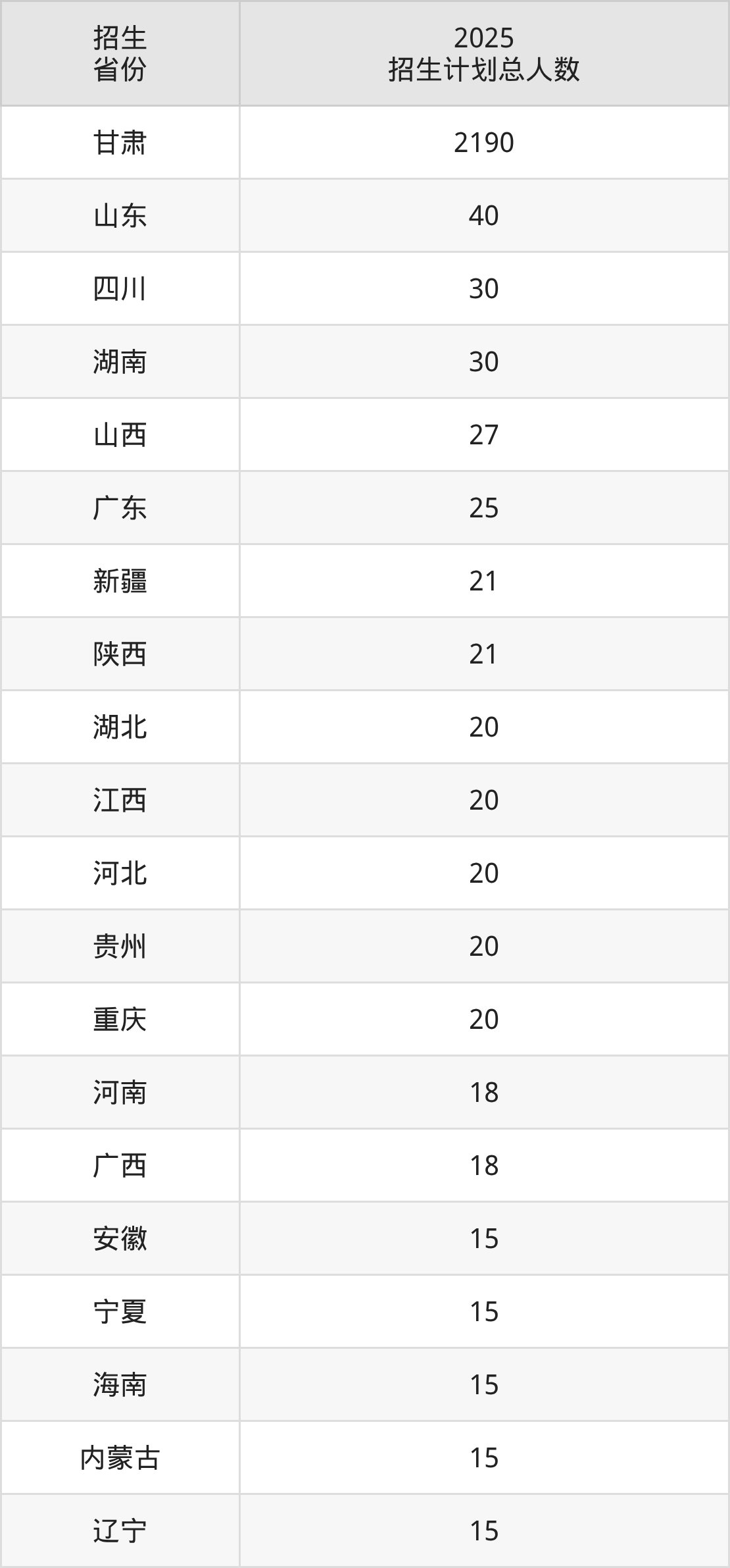 2025年天水师范大学面向全国25个省市开展本科招生;招生专业共44个,招生人数共2670人。2025年在甘肃省招生计划总人数是2190人,其中,天水师范大学在甘肃省招生人数最多的是电气工程及其自动化。天水师范大学在各省具体招生人数情况如下表。