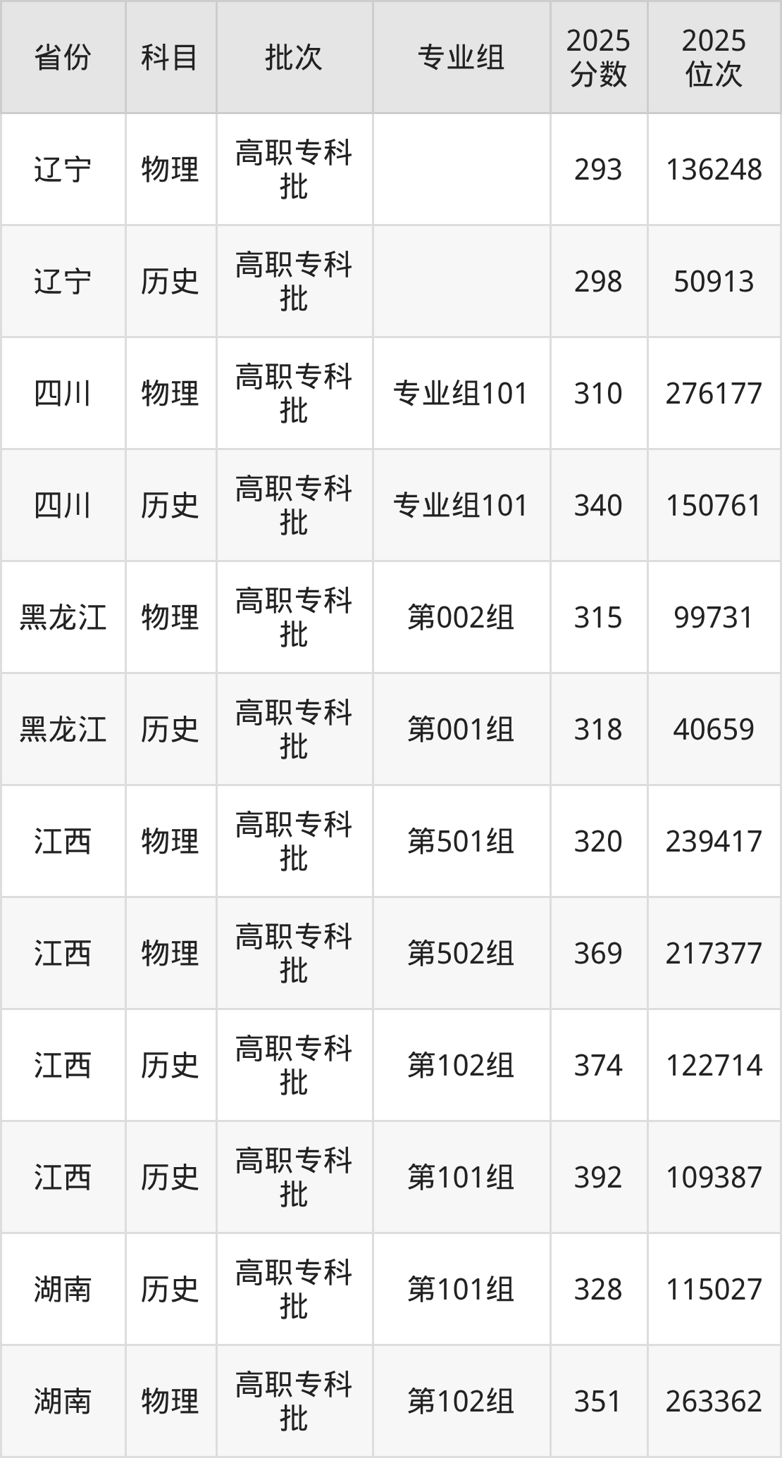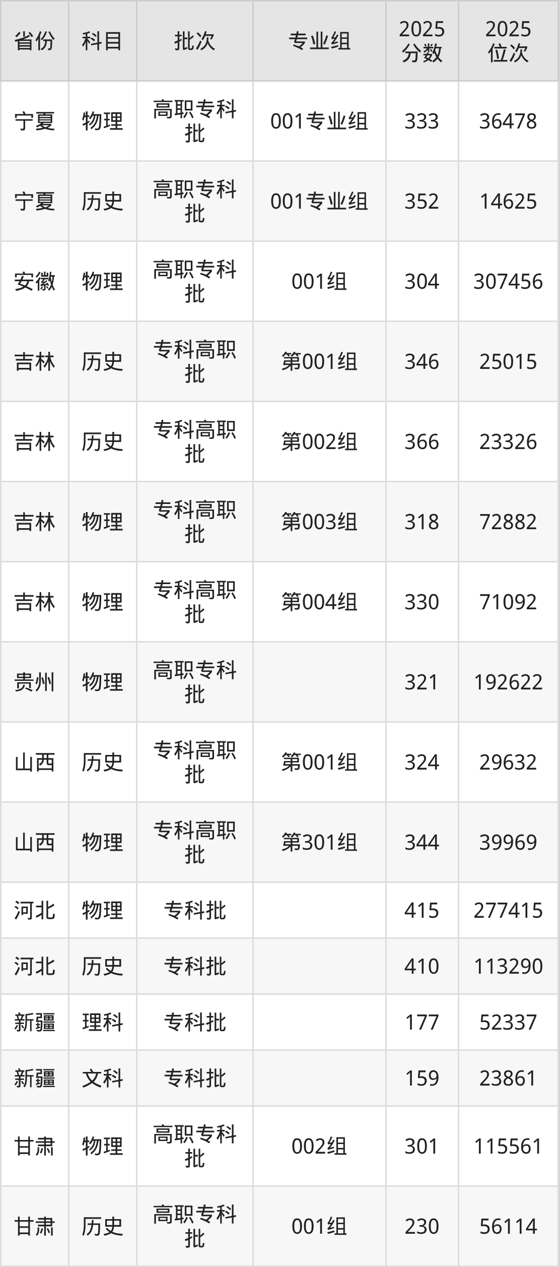 2025年在专科物理类进行招生,各专业组分数线详情如下: