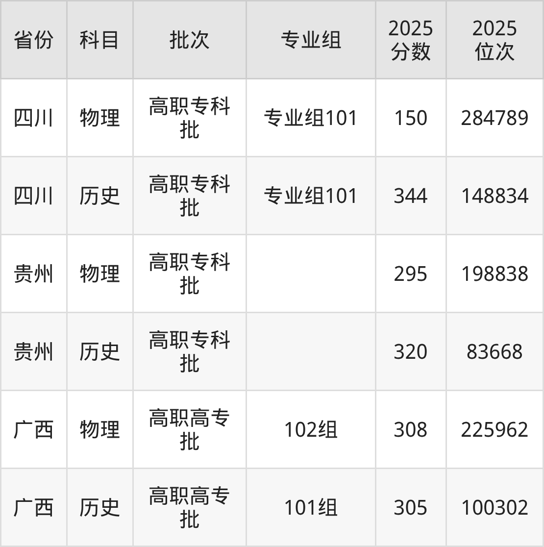广西现代职业技术学院专业组101:2025年投档录取最低分为150分,录取最低位次为284789名。