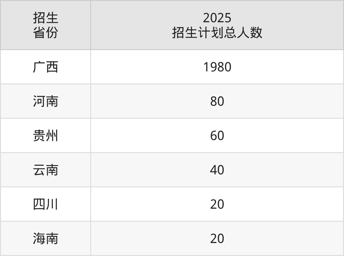 2025年广西现代职业技术学院面向全国6个省市开展专科招生;招生专业共44个,招生人数共2200人。2025年在广西壮族自治区招生计划总人数是1980人,其中,广西现代职业技术学院在广西壮族自治区招生人数最多的是小学教育。广西现代职业技术学院在各省具体招生人数情况如下表。
