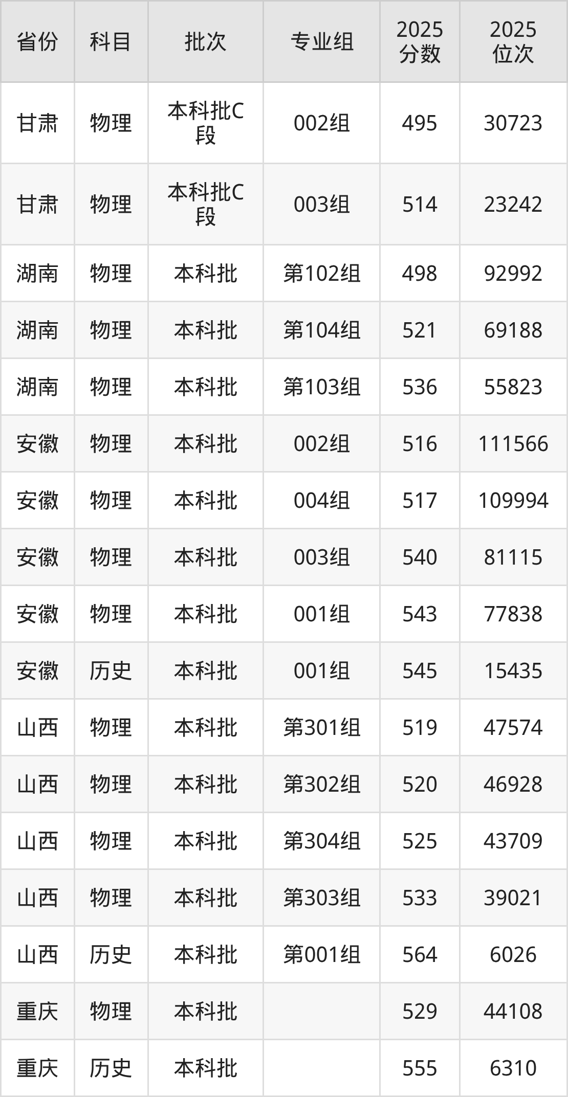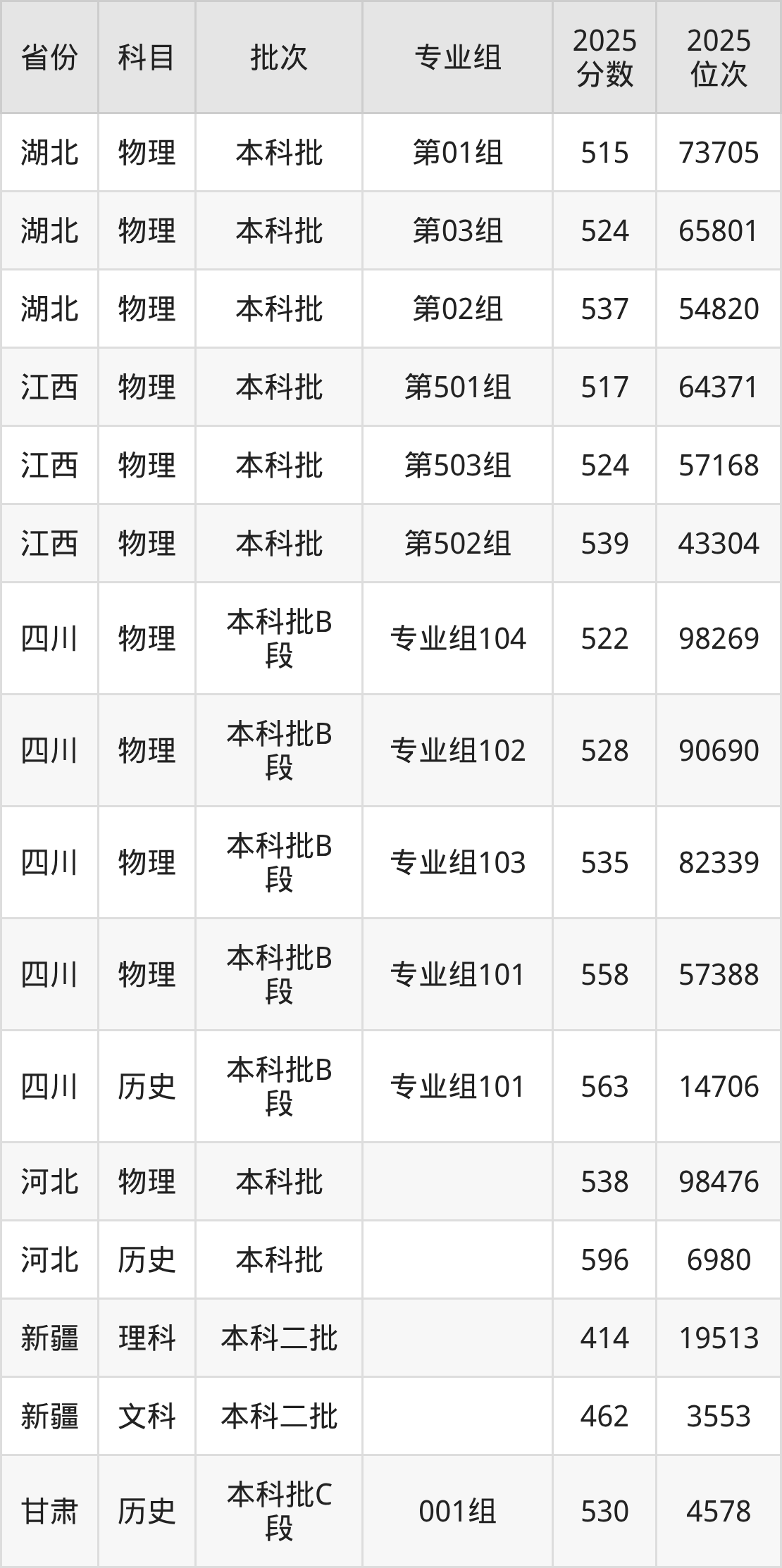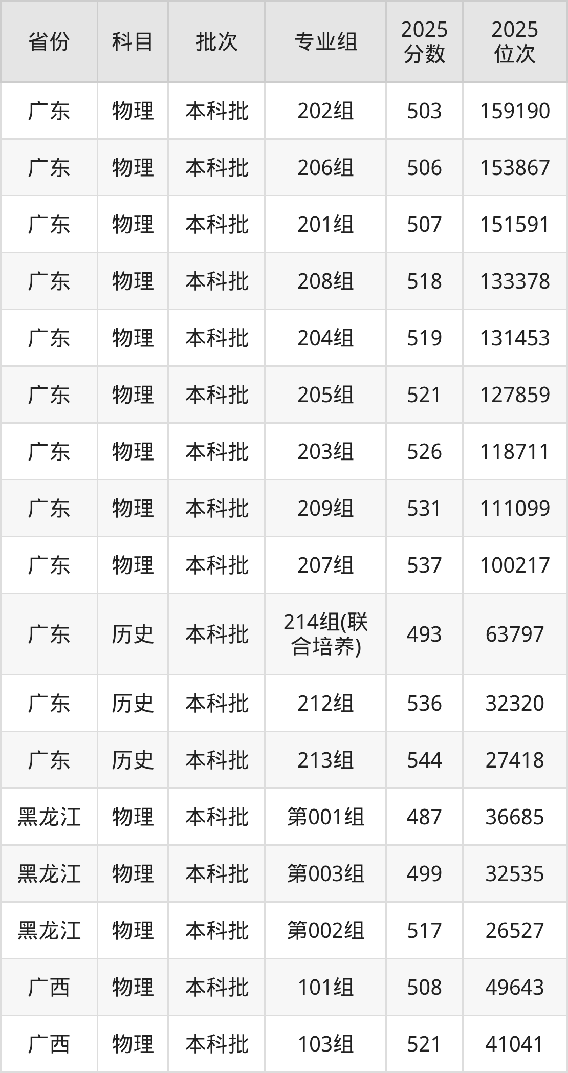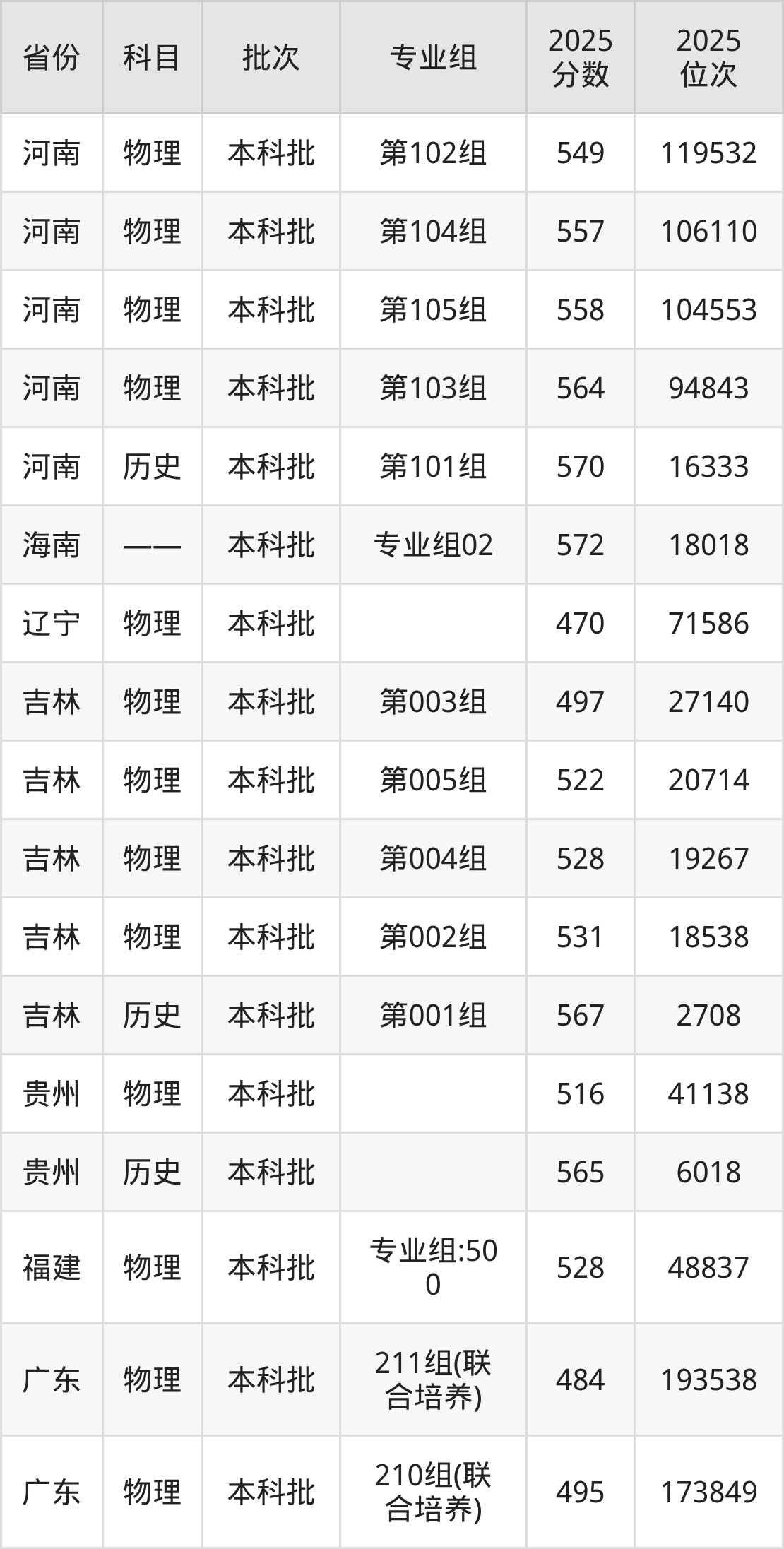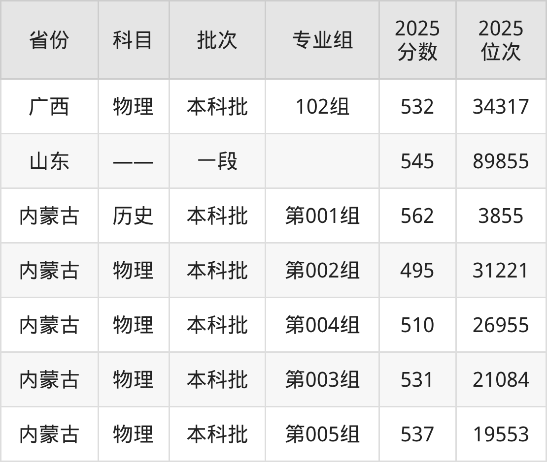 2025年在本科物理类进行招生,各专业组分数线详情如下: