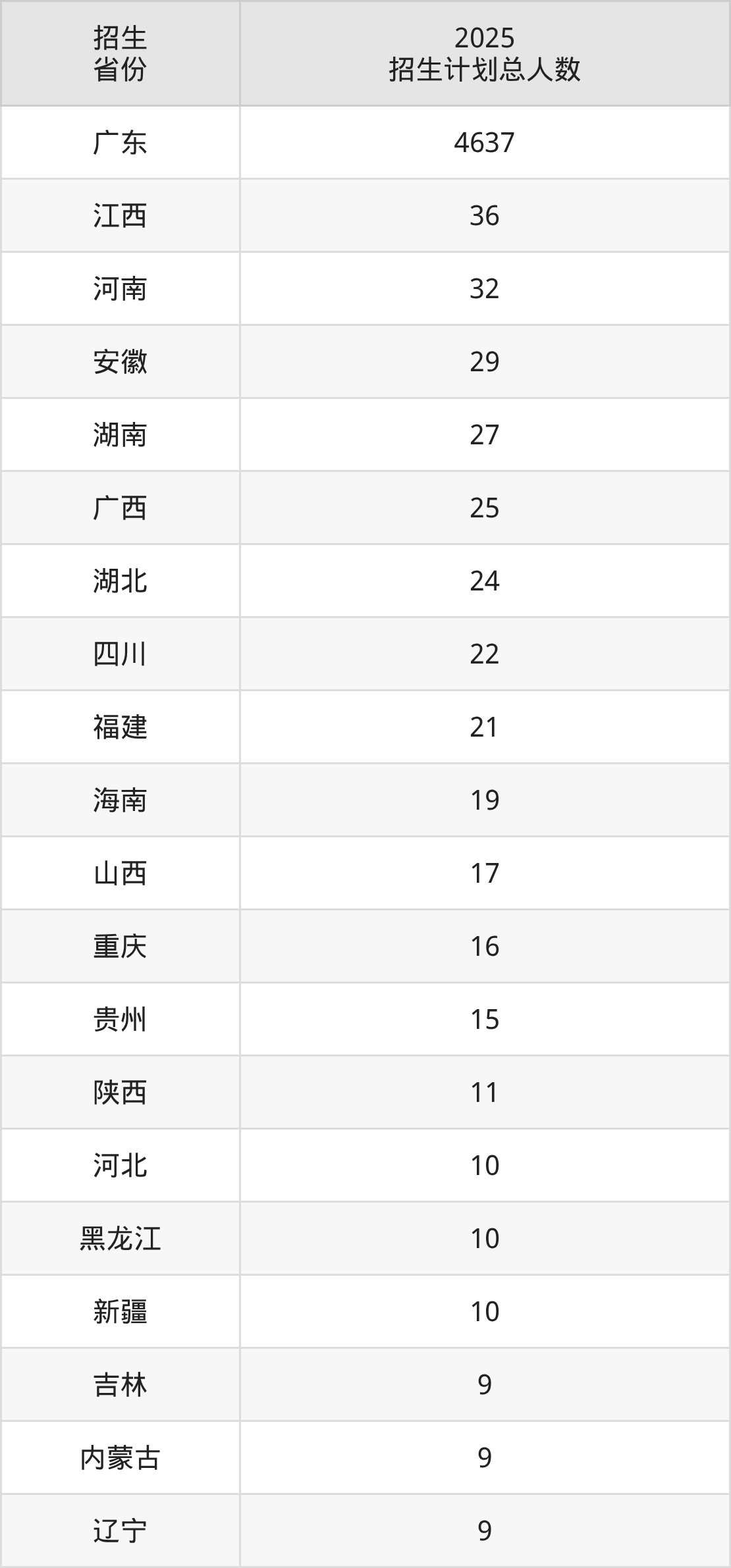 2025年五邑大学面向全国23个省市开展本科招生;招生专业共38个,招生人数共5003人。2025年在广东省招生计划总人数是4637人,其中,五邑大学在广东省招生人数最多的是电子信息工程。五邑大学在各省具体招生人数情况如下表。