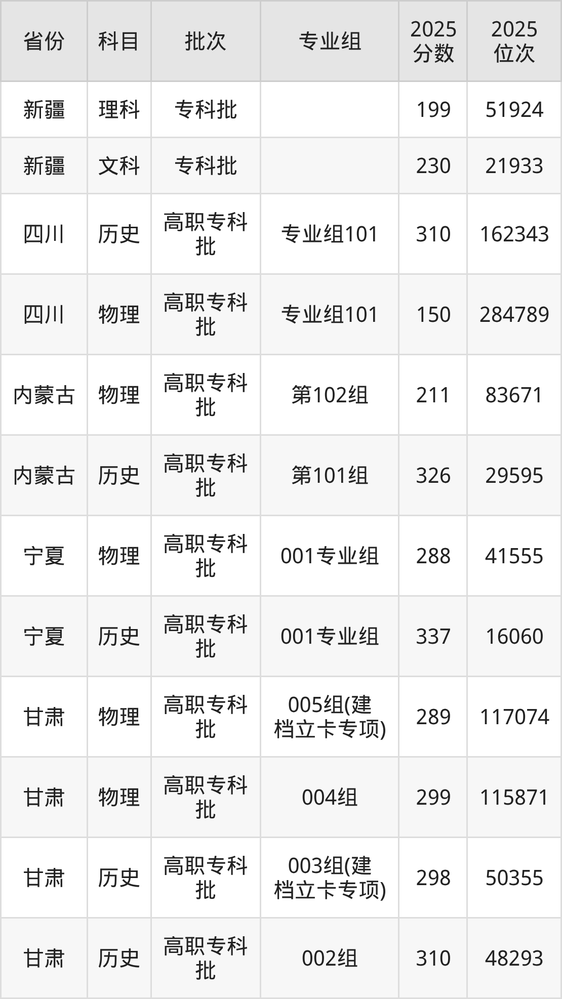 2025年兰州现代职业学院全国录取分数线是150分到337分,录取最低在四川物理类(专业组101)、录取最高在宁夏历史类(001专业组)。各省各专业组最低分具有差异,详情如下: