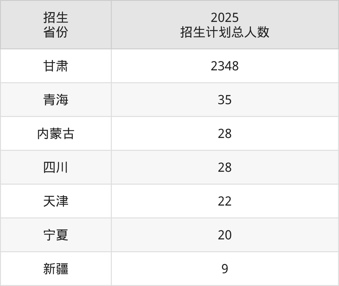 2025年兰州现代职业学院面向全国7个省市开展专科招生;招生专业共54个,招生人数共2490人。2025年在甘肃省招生计划总人数是2348人,其中,兰州现代职业学院在甘肃省招生人数最多的是畜牧兽医。兰州现代职业学院在各省具体招生人数情况如下表。