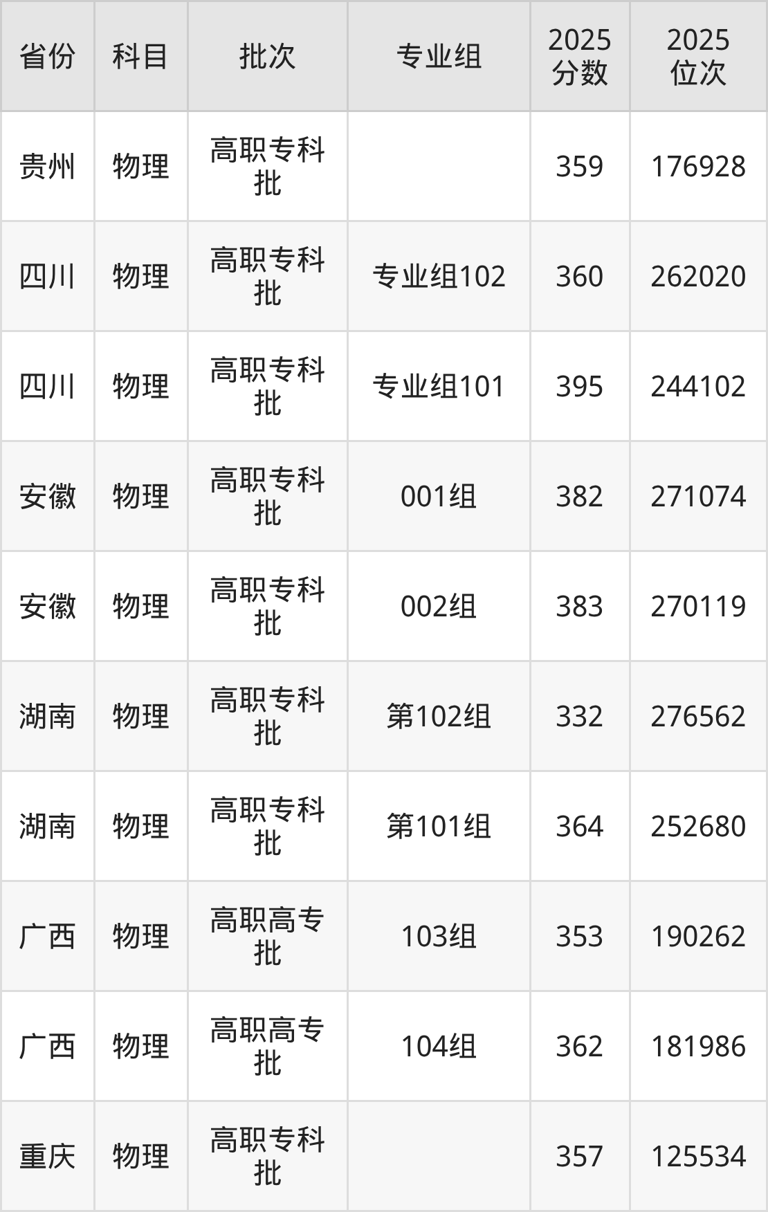 2025年在专科物理类进行招生,各专业组分数线详情如下: