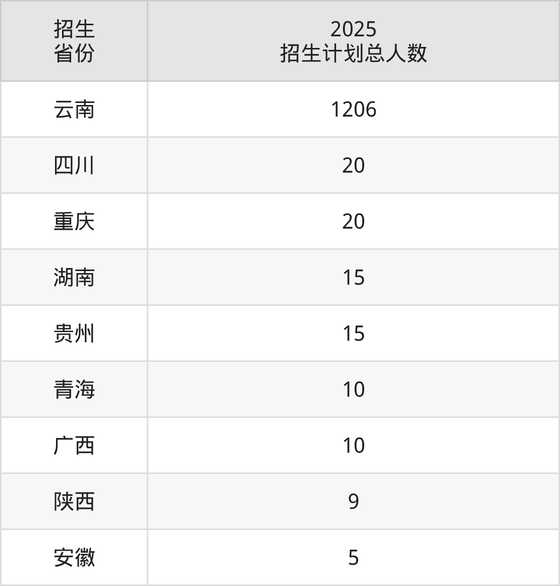 2025年云南交通职业技术学院面向全国9个省市开展专科招生;招生专业共36个,招生人数共1310人。2025年在云南省招生计划总人数是1206人,其中,云南交通职业技术学院在云南省招生人数最多的是道路与桥梁工程技术。云南交通职业技术学院在各省具体招生人数情况如下表。