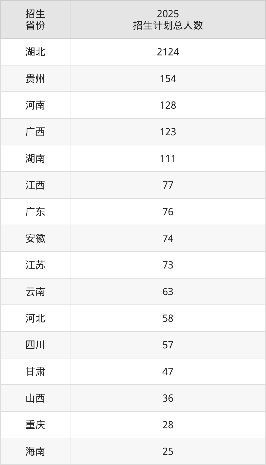 2025年湖北中医药大学面向全国26个省市开展本科招生;招生专业共32个,招生人数共3425人。2025年在湖北省招生计划总人数是2124人,其中,湖北中医药大学在湖北省招生人数最多的是护理学。湖北中医药大学在各省具体招生人数情况如下表。
