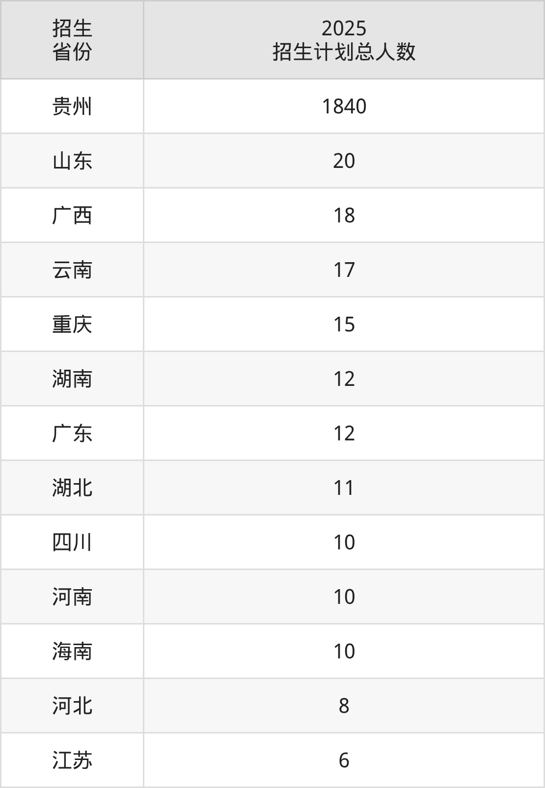 2025年贵阳康养职业大学面向全国13个省市开展本科招生;招生专业共19个,招生人数共1989人。2025年在贵州省招生计划总人数是1840人,其中,贵阳康养职业大学在贵州省招生人数最多的是药学。贵阳康养职业大学在各省具体招生人数情况如下表。