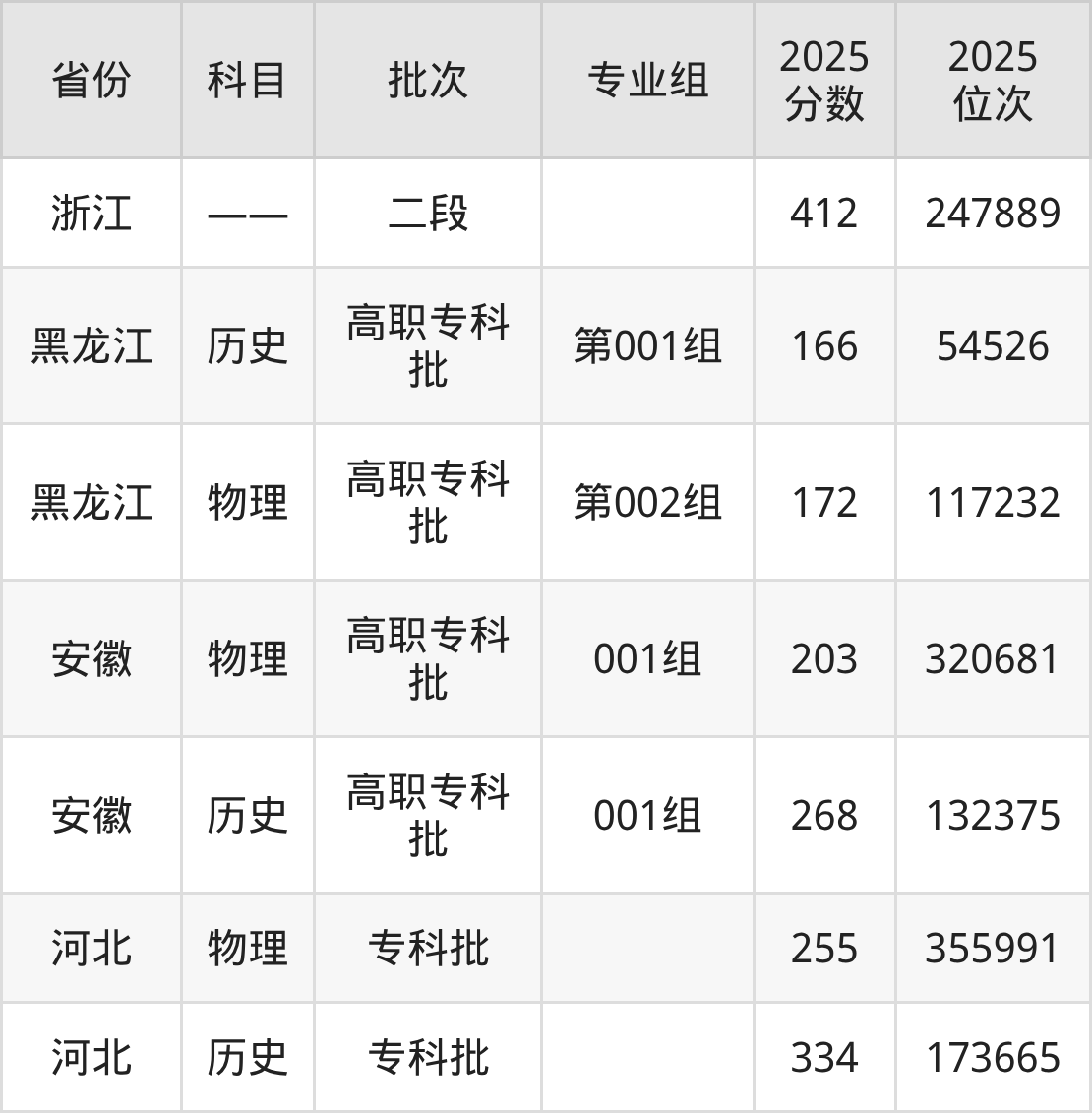 2025年民办万博科技职业学院全国录取分数线是166分到417分,录取最低在黑龙江历史类(第001组)、录取最高在浙江。各省各专业组最低分具有差异,详情如下: