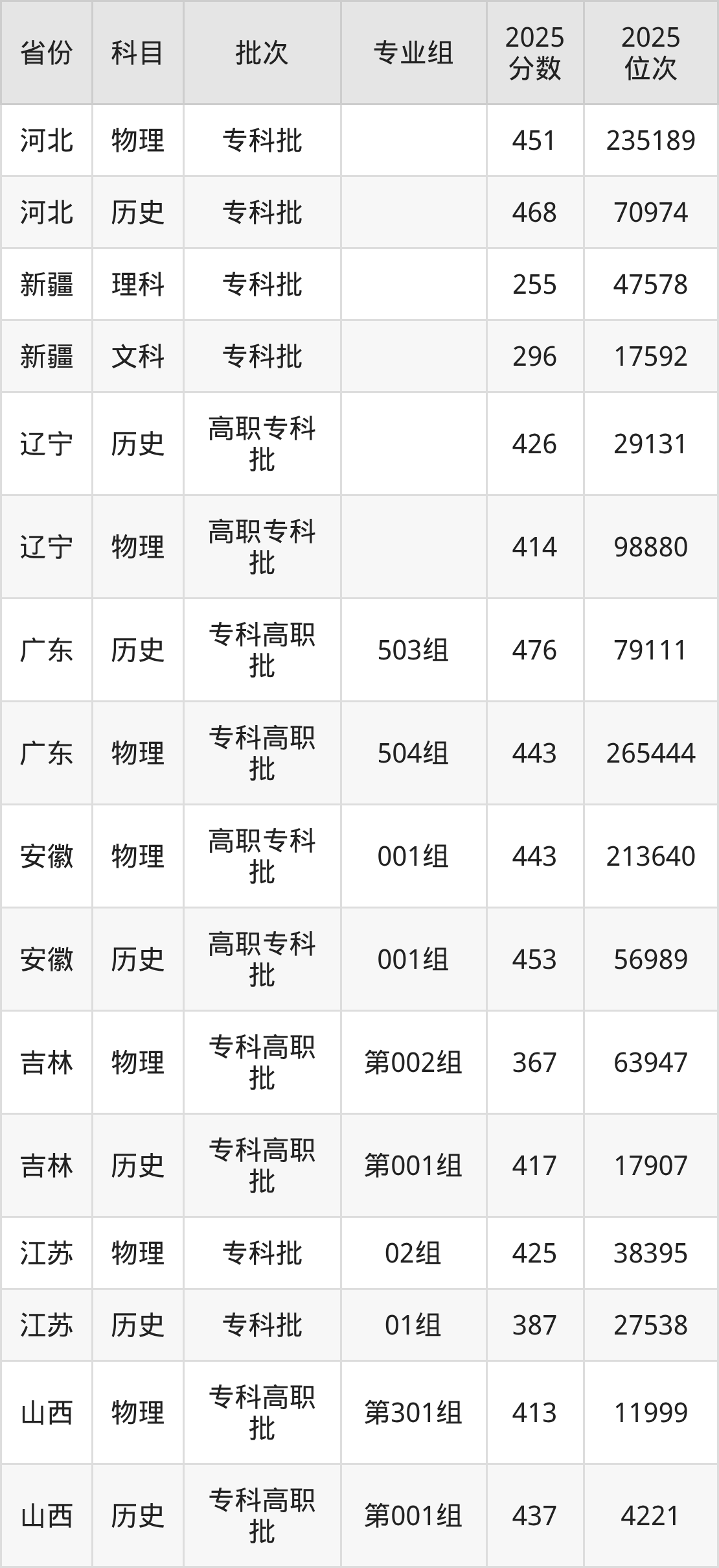 2025年柳州铁道职业技术学院全国录取分数线是255分到481分,录取最低在新疆理科、录取最高在江西历史类(第101组)。各省各专业组最低分具有差异,详情如下: