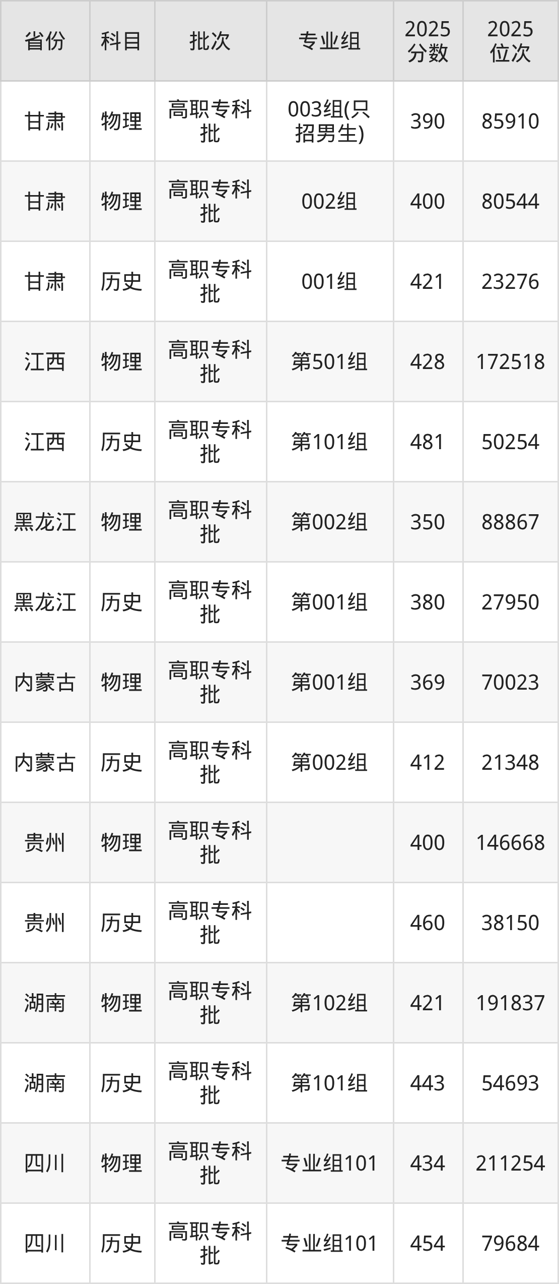 柳州铁道职业技术学院003专业组(只招男生):2025年投档录取最低分为390分,录取最低位次为85910名。