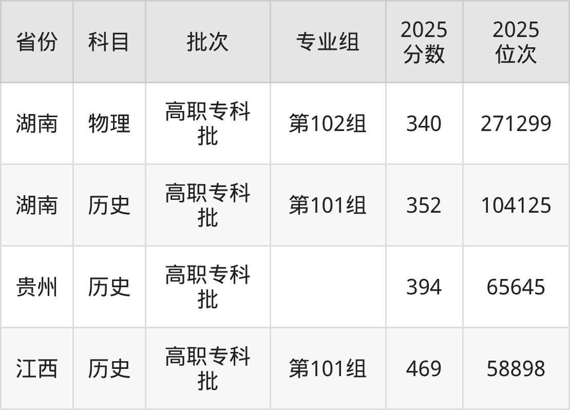 2025年在专科历史类进行招生,各专业组分数线详情如下:
