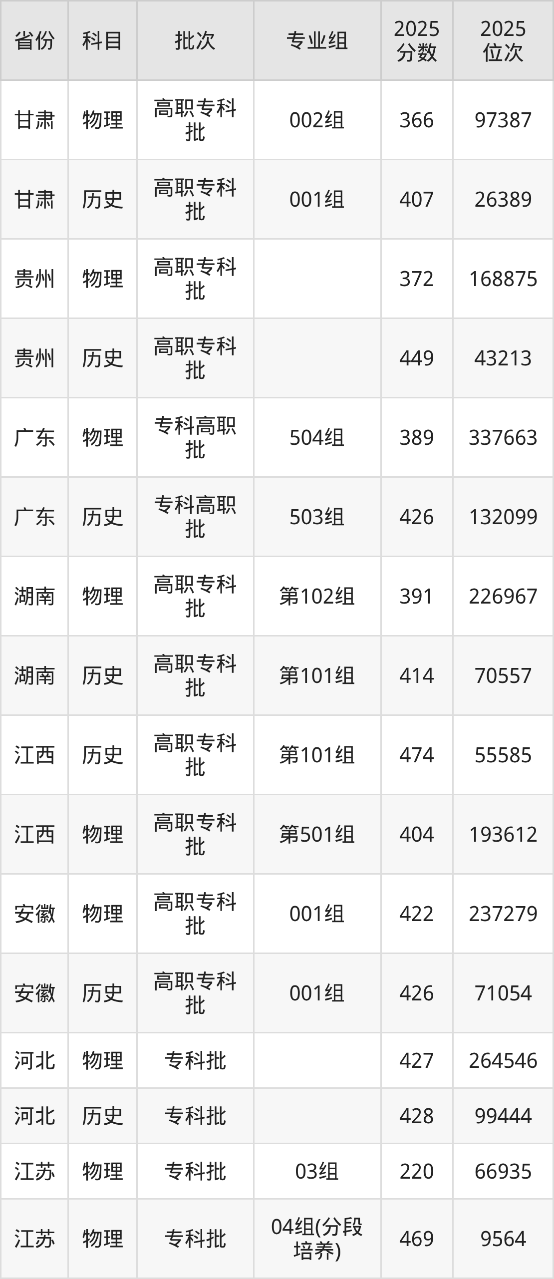 普通类专科历史类最低426分,专科物理类最低389分