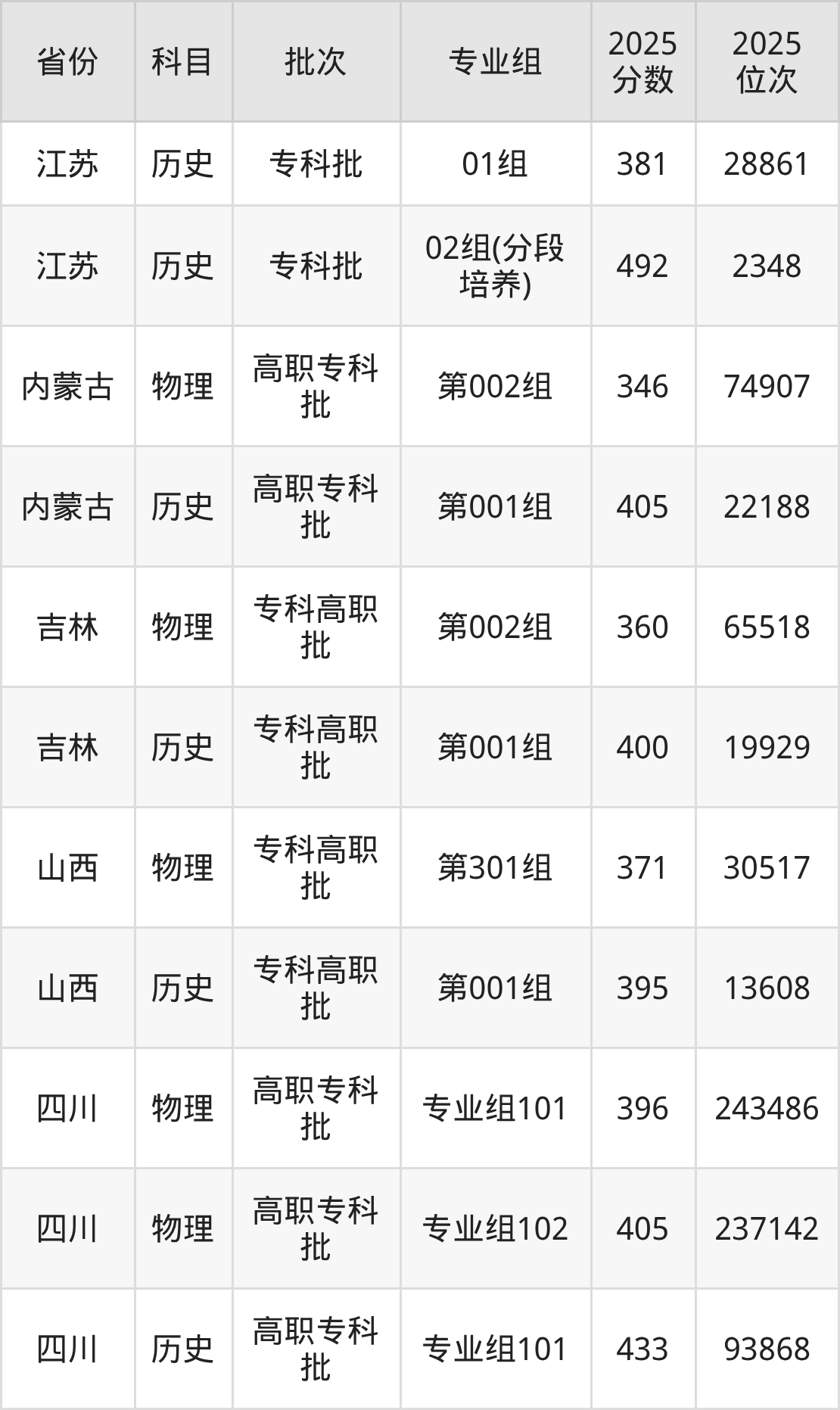 普通类专科物理类最低371分,专科历史类最低395分