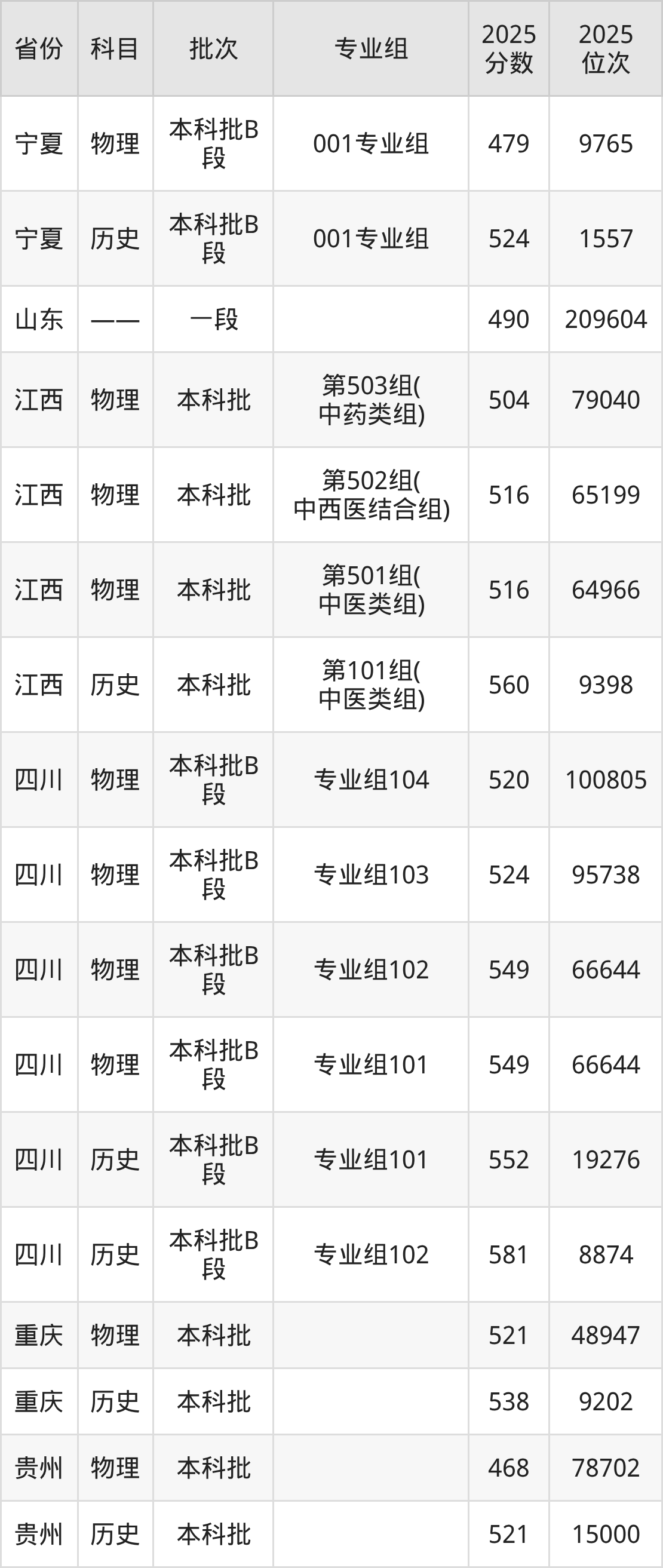 2025年重庆中医药学院全国录取分数线是468分到581分,录取最低在贵州物理类、录取最高在四川历史类(专业组102)。各省各专业组最低分具有差异,详情如下: