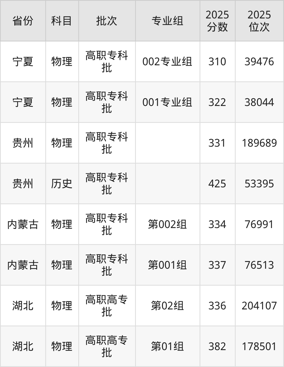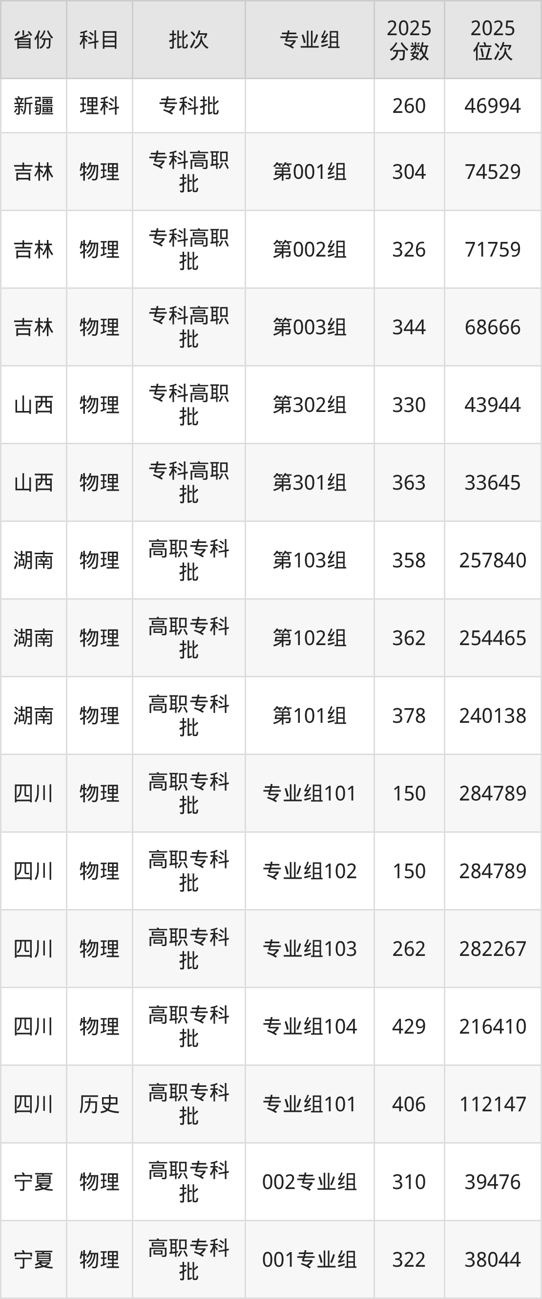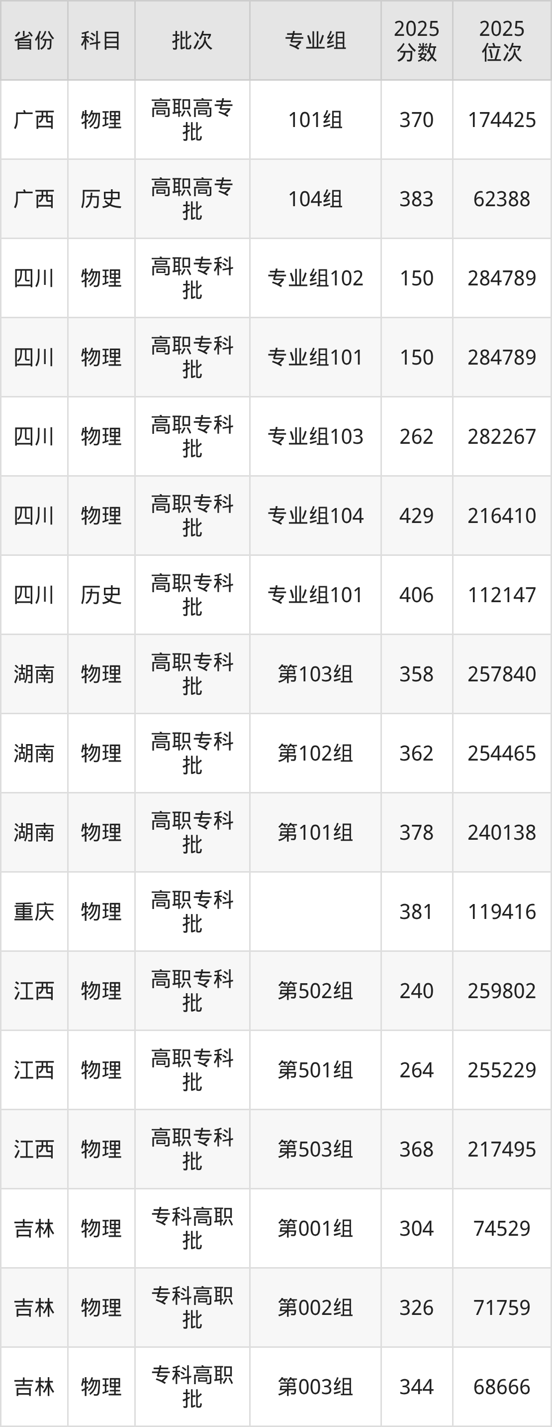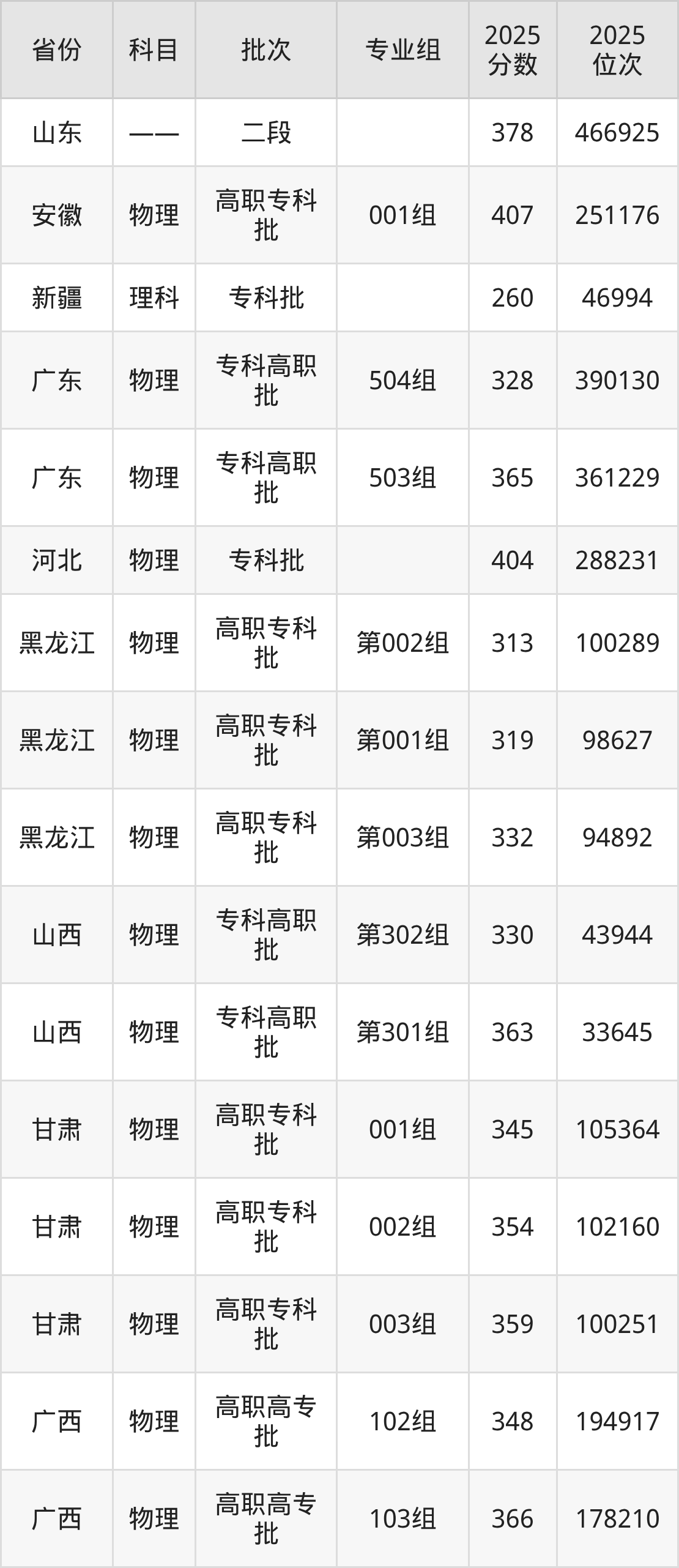 2025年在专科物理类进行招生,各专业组分数线详情如下: