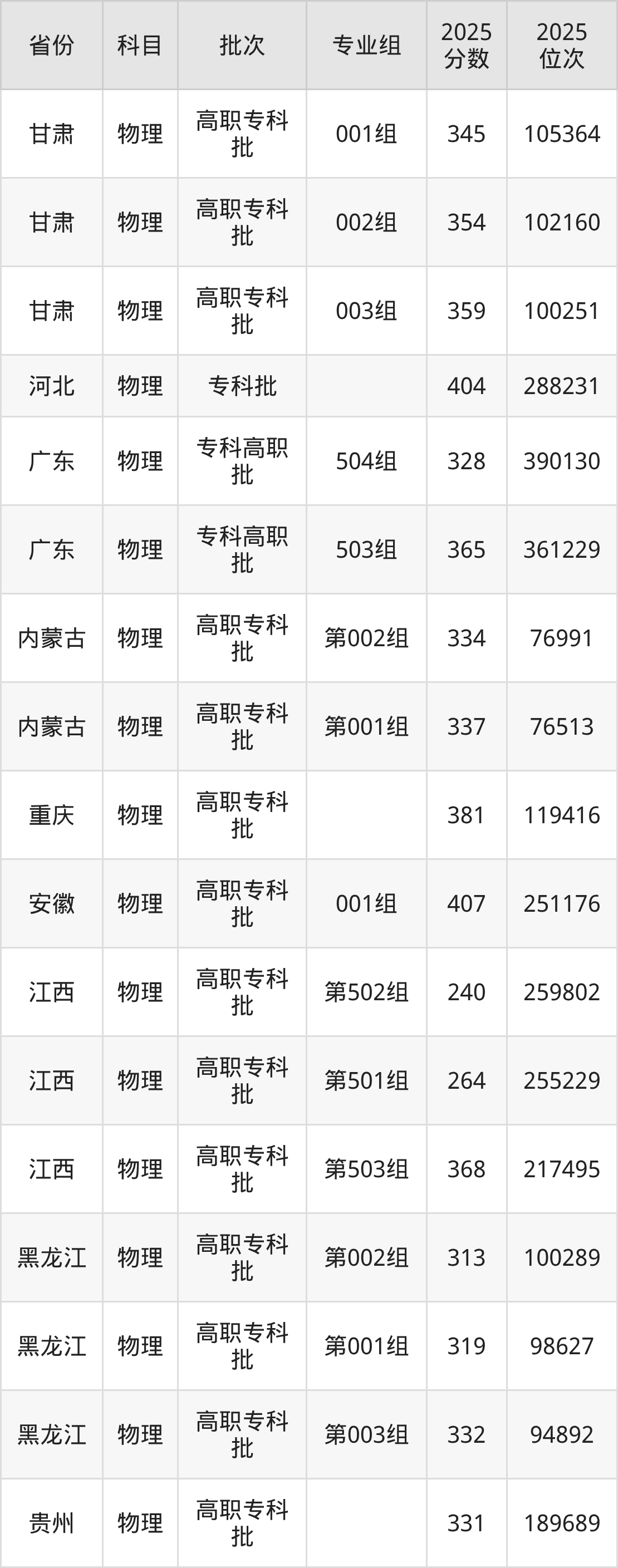 专科物理类投档录取最低404分