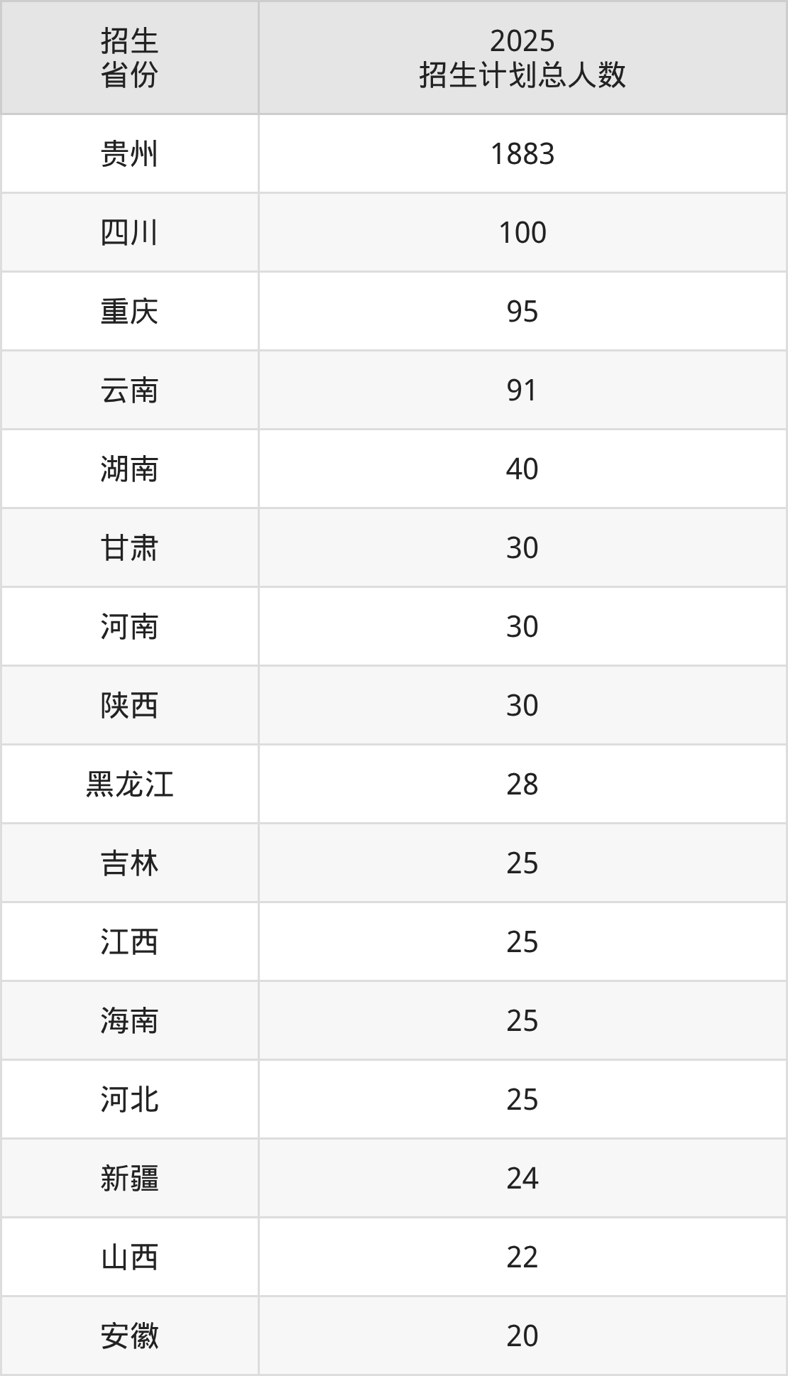 2025年黔南民族医学高等专科学校面向全国20个省市开展专科招生;招生专业共16个,招生人数共2573人。2025年在贵州省招生计划总人数是1883人,其中,黔南民族医学高等专科学校在贵州省招生人数最多的是临床医学。黔南民族医学高等专科学校在各省具体招生人数情况如下表。