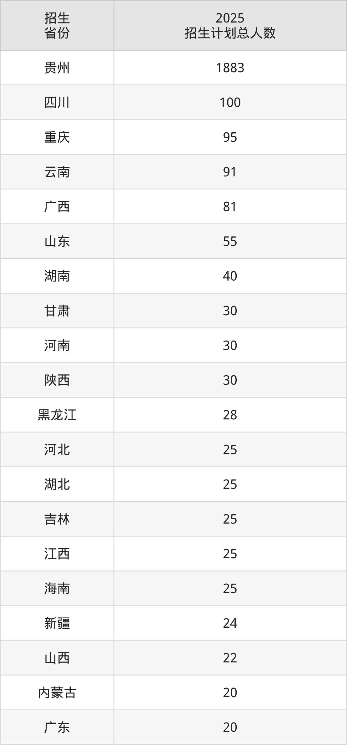 2025年黔南民族医学高等专科学校面向全国23个省市开展专科招生;招生专业共16个,招生人数共2734人。2025年在贵州省招生计划总人数是1883人,其中,黔南民族医学高等专科学校在贵州省招生人数最多的是临床医学。黔南民族医学高等专科学校在各省具体招生人数情况如下表。