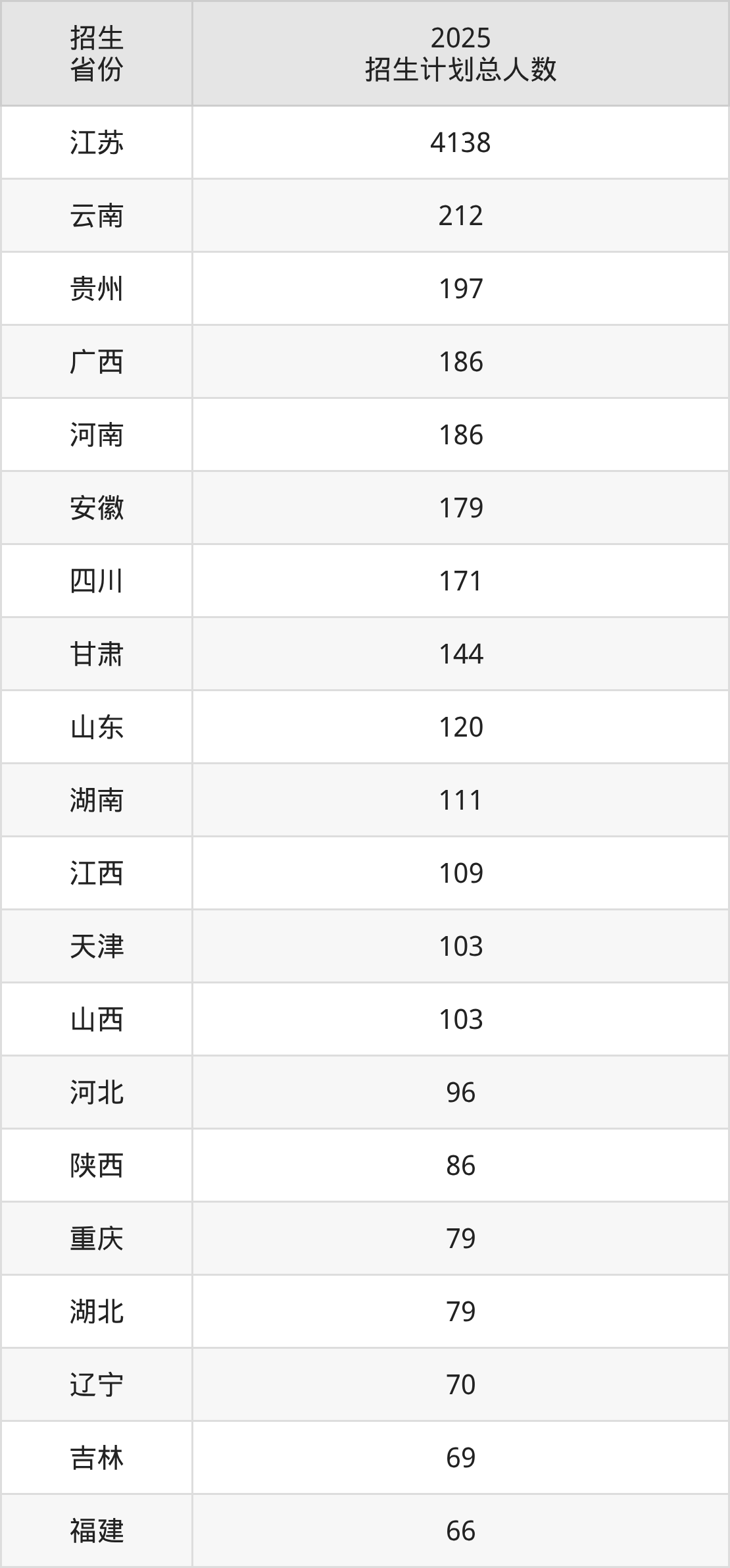 2025年江苏大学面向全国29个省市开展本科招生;招生专业共72个,招生人数共6869人。2025年在江苏省招生计划总人数是4138人,其中,江苏大学在江苏省招生人数最多的是临床医学。江苏大学在各省具体招生人数情况如下表。