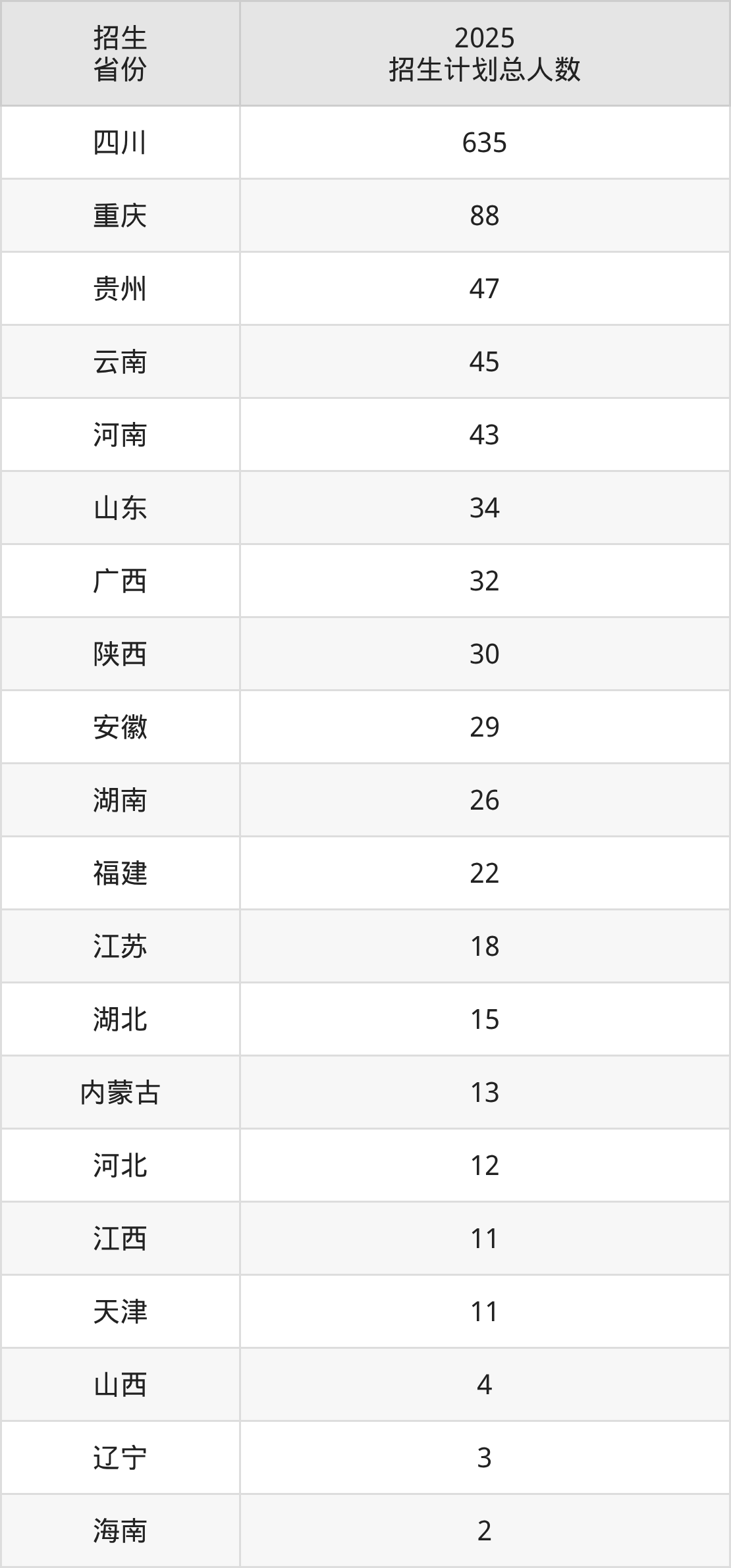 2025年成都体育学院面向全国20个省市开展本科招生;招生专业共11个,招生人数共1120人。2025年在四川省招生计划总人数是635人,其中,成都体育学院在四川省招生人数最多的是中医骨伤科学。成都体育学院在各省具体招生人数情况如下表。