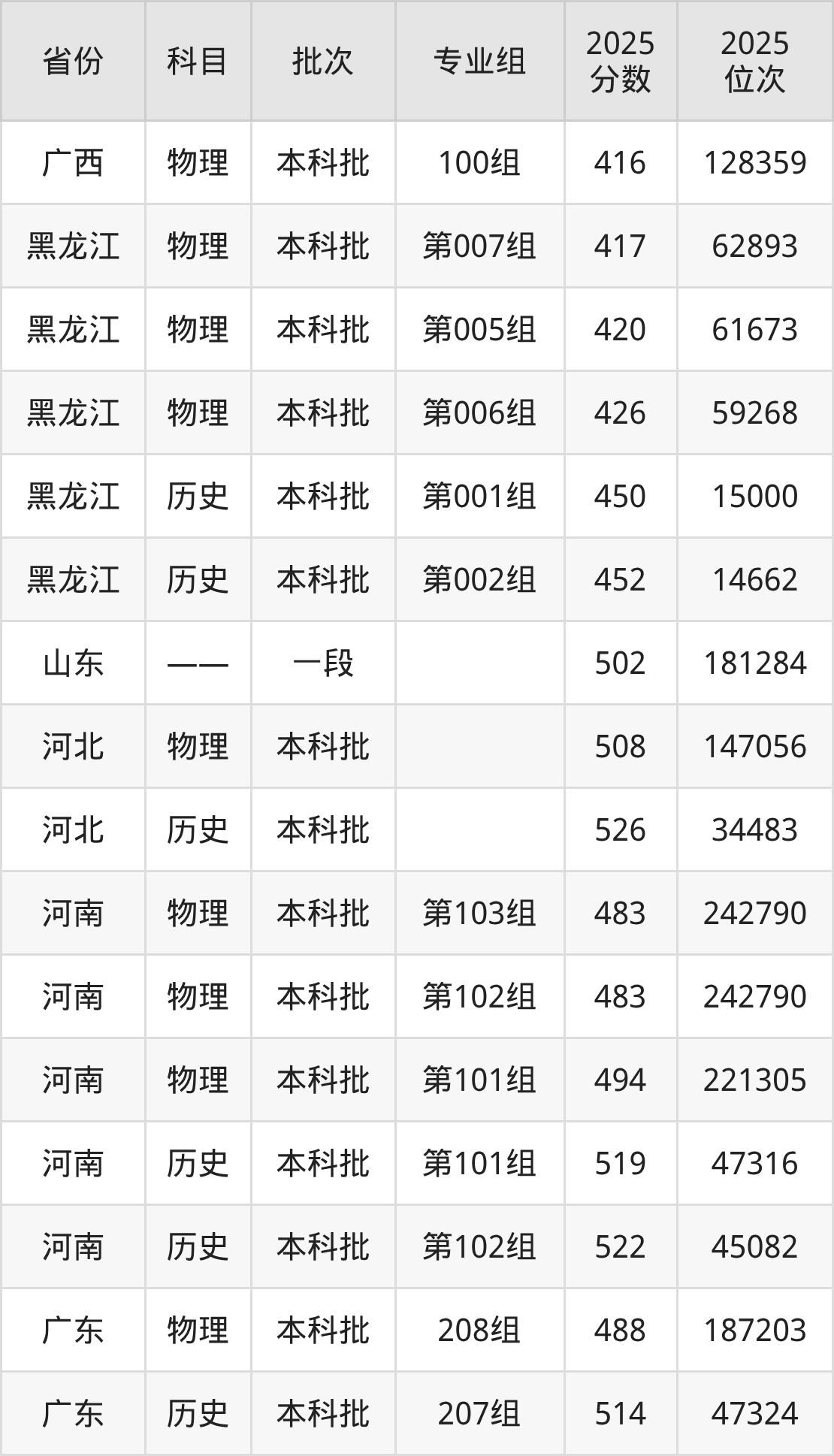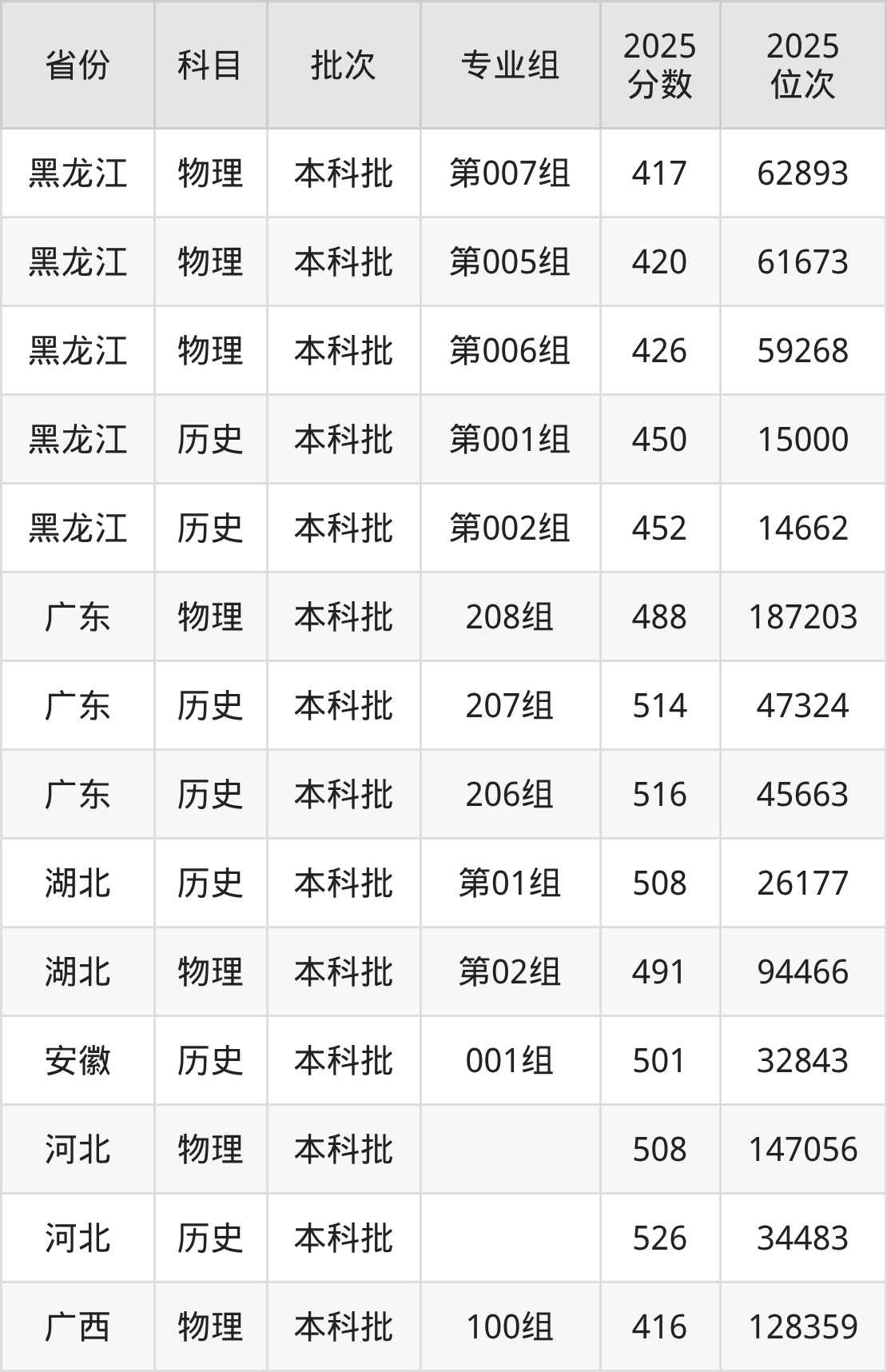 2025年在本科物理类进行招生,各专业组分数线详情如下: