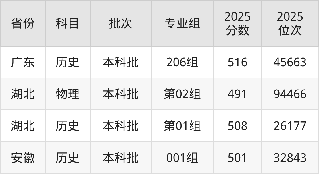 2025年在本科历史类进行招生,各专业组分数线详情如下: