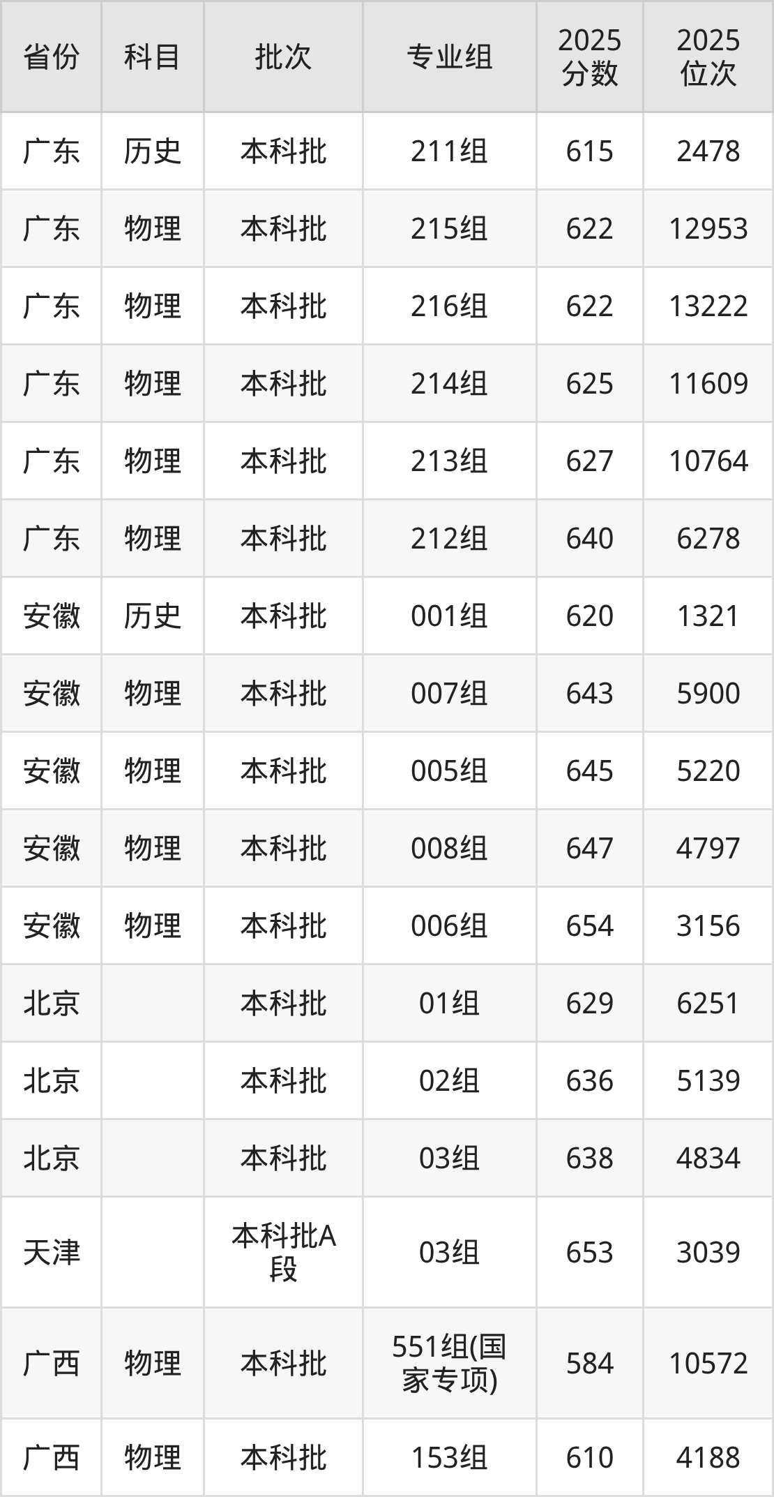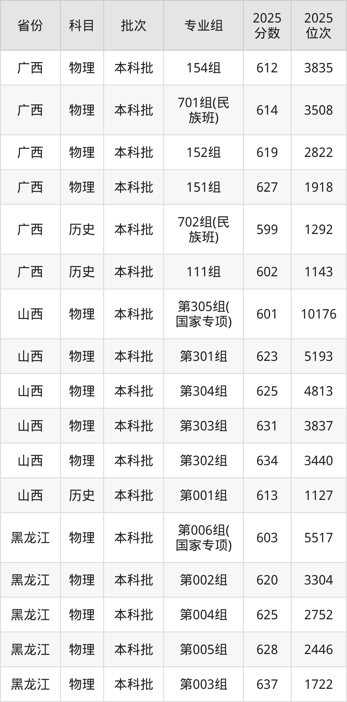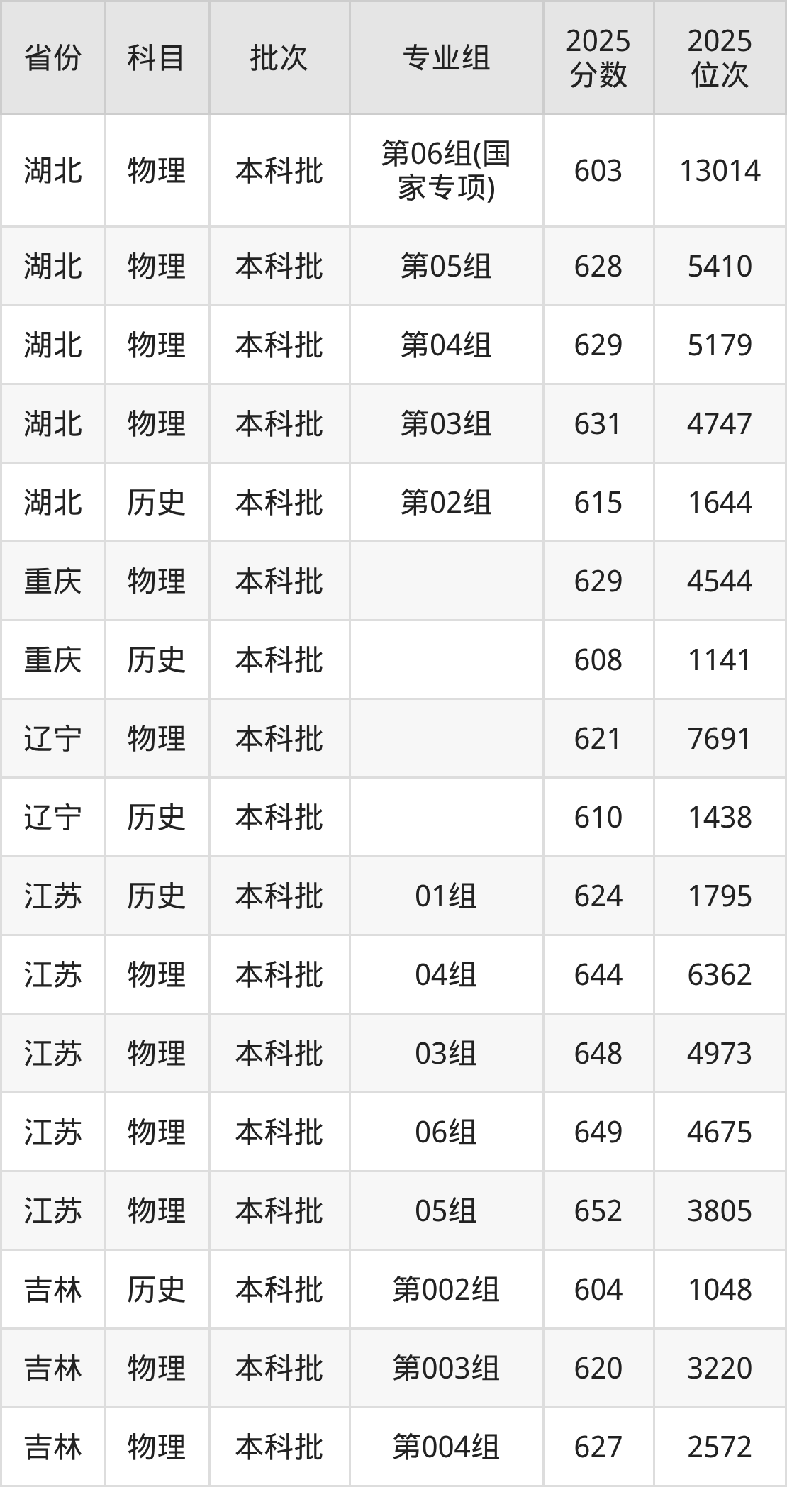 2025年在本科物理类进行招生,各专业组分数线详情如下: