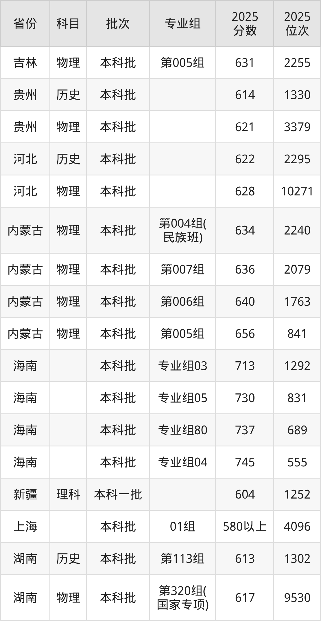 华南理工大学第005组:2025年投档录取最低分为631分,录取最低位次为2255名。