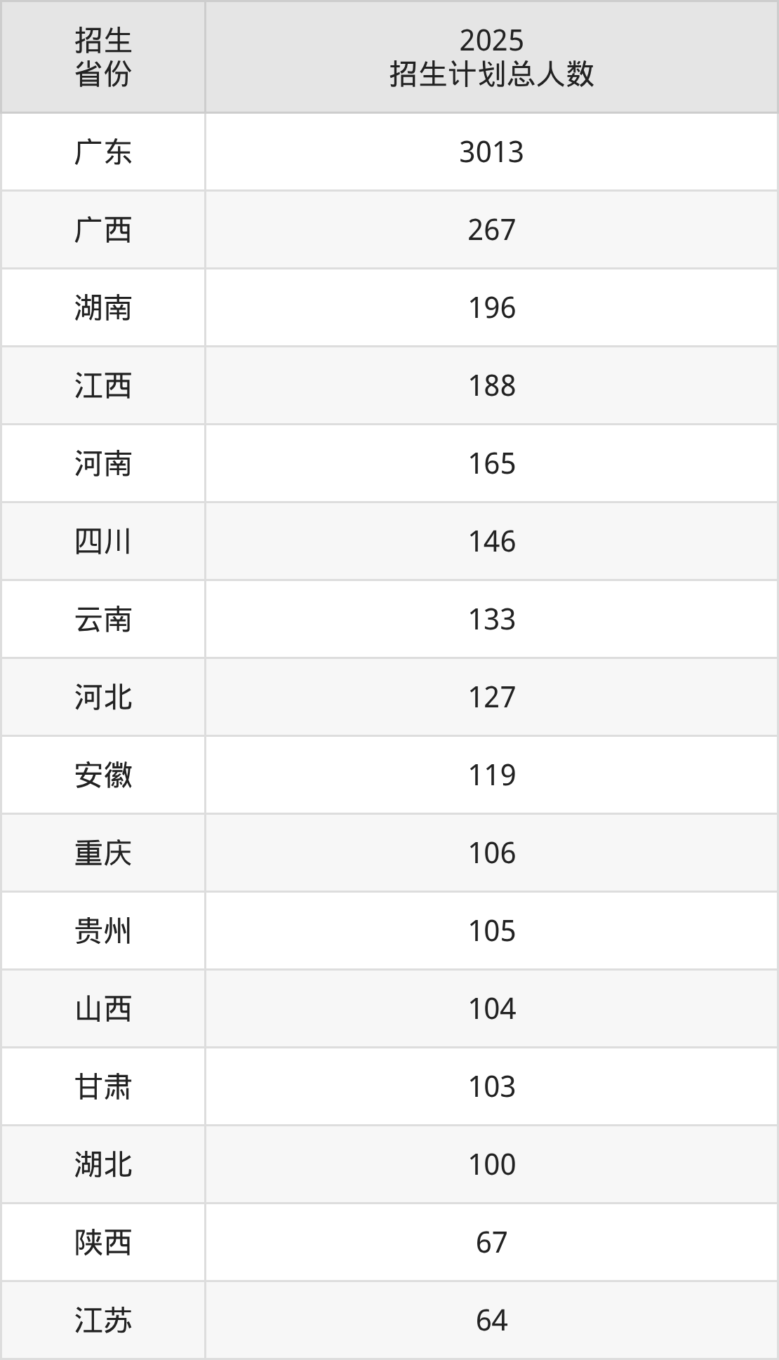 2025年华南理工大学面向全国28个省市开展本科招生;招生专业共26个,招生人数共5448人。2025年在广东省招生计划总人数是3013人,其中,华南理工大学在广东省招生人数最多的是工科试验班。华南理工大学在各省具体招生人数情况如下表。