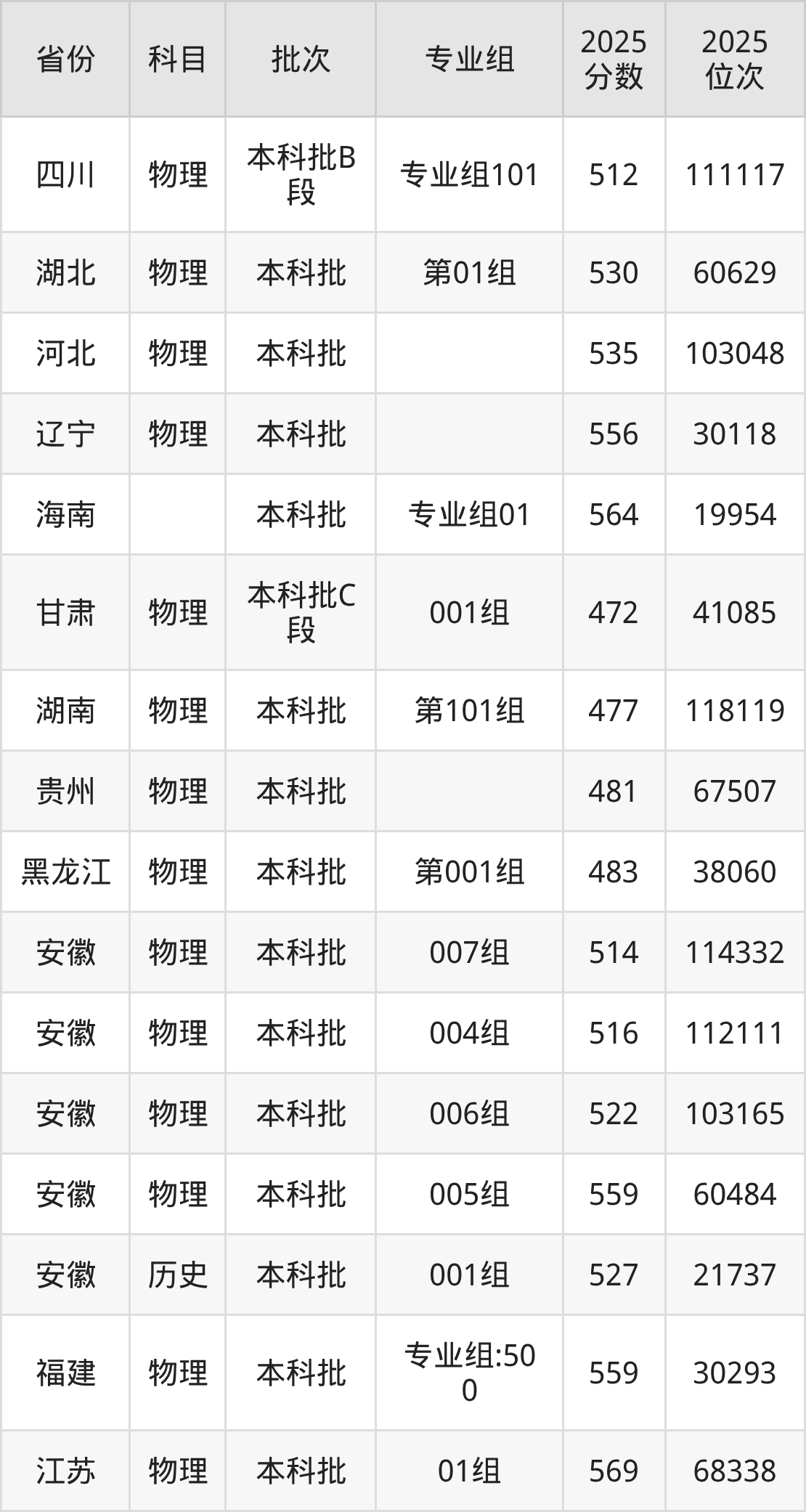 2025年在本科物理类进行招生,各专业组分数线详情如下: