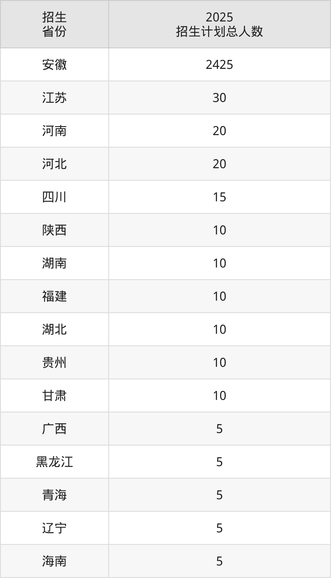 2025年蚌埠医科大学面向全国17个省市开展本科招生;招生专业共26个,招生人数共2600人。2025年在安徽省招生计划总人数是2425人,其中,蚌埠医科大学在安徽省招生人数最多的是临床医学。蚌埠医科大学在各省具体招生人数情况如下表。