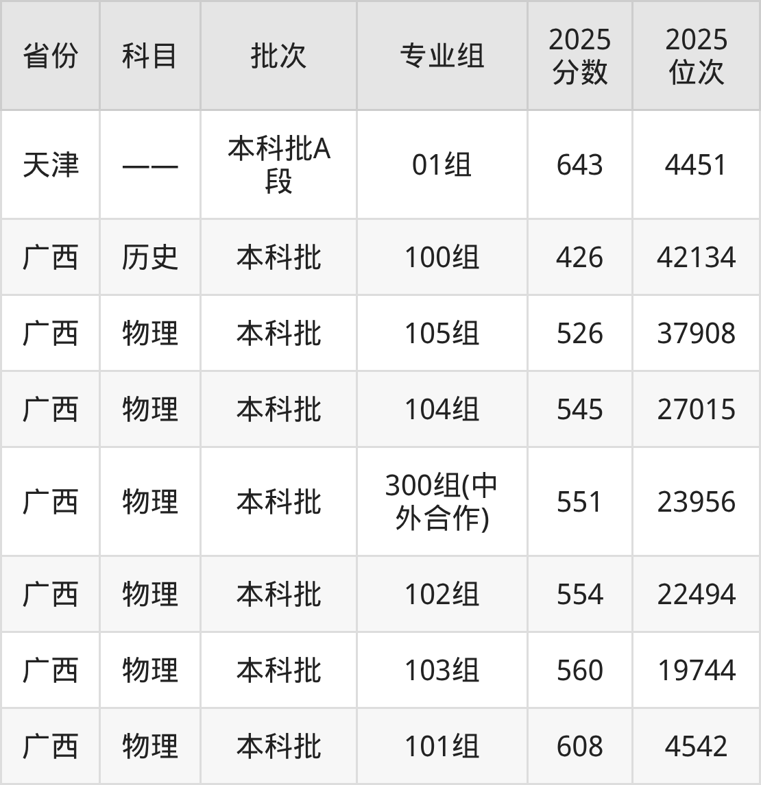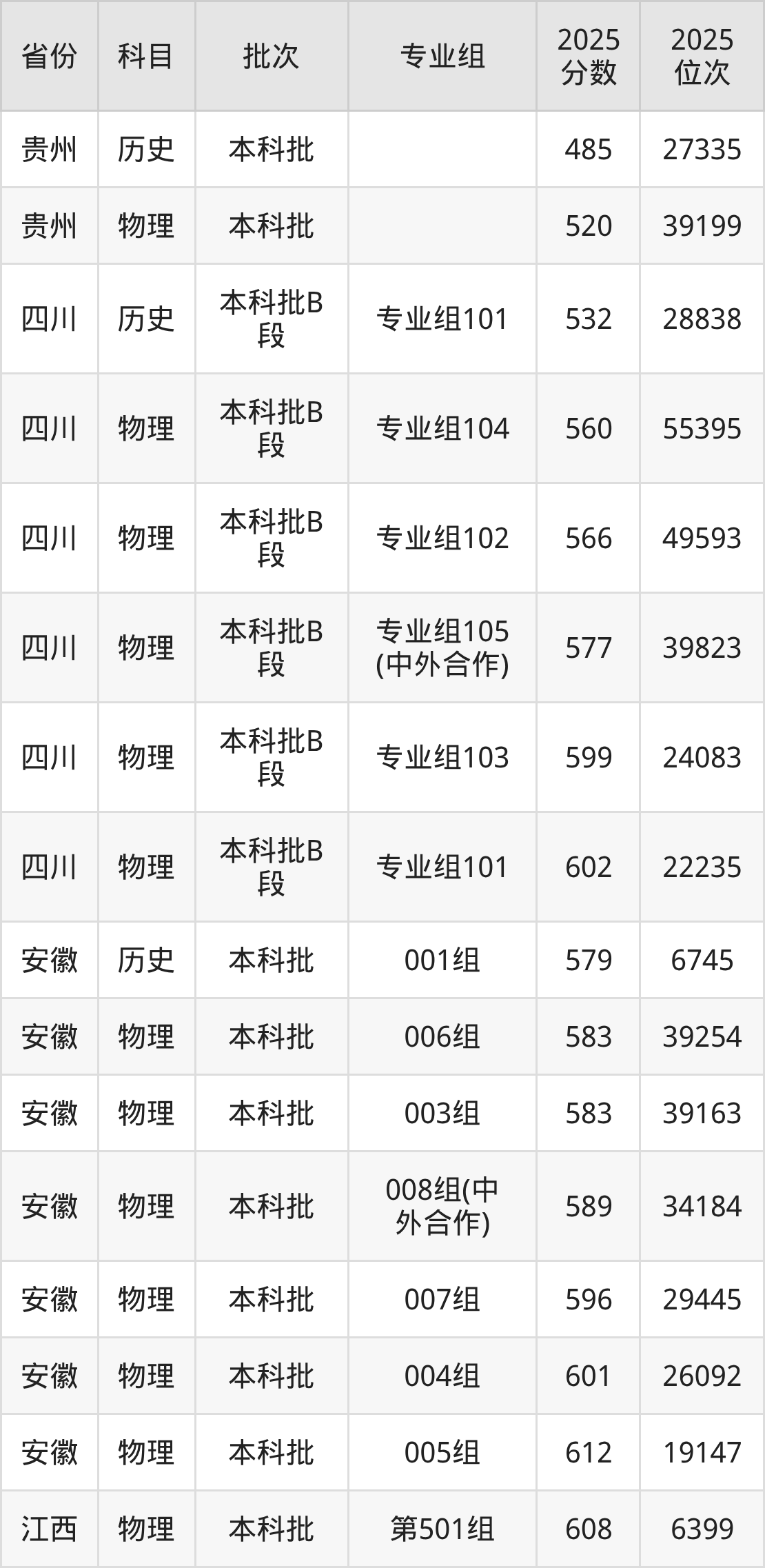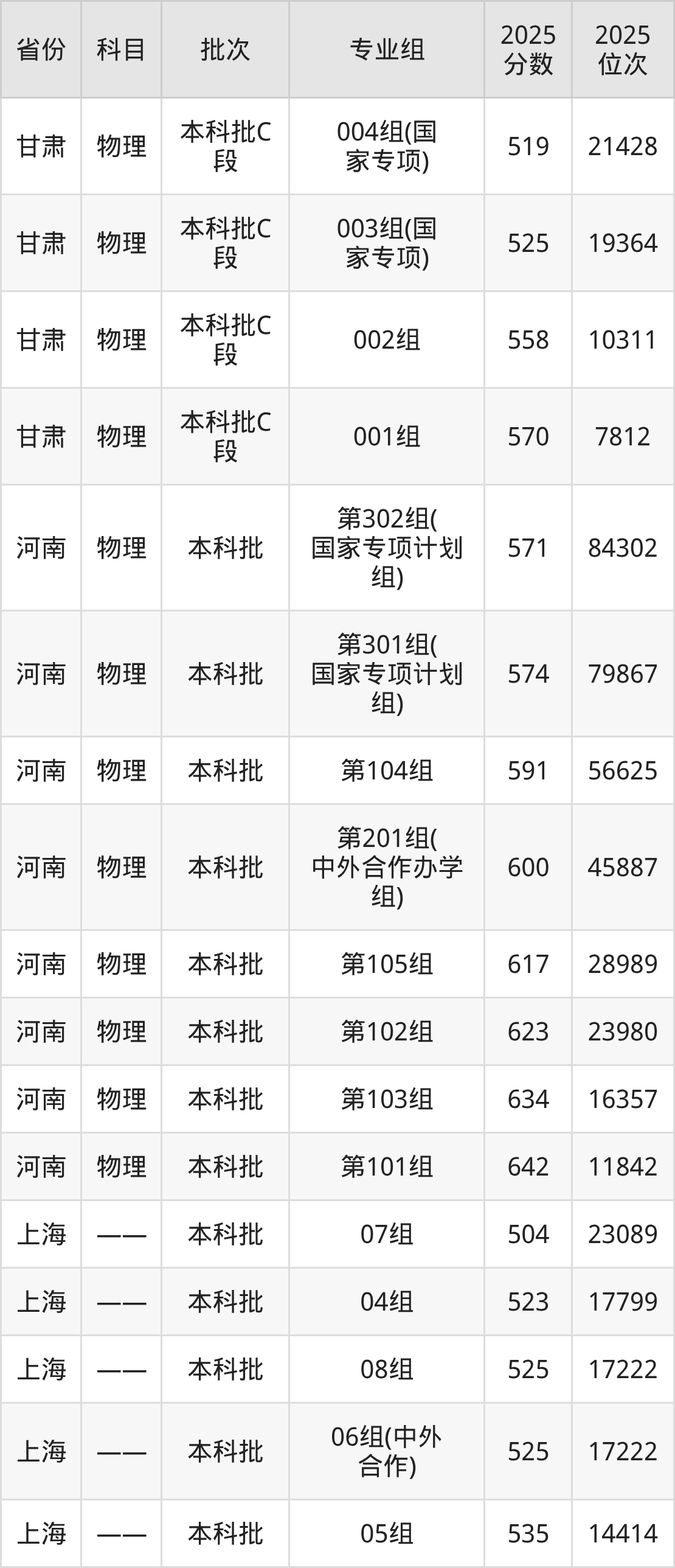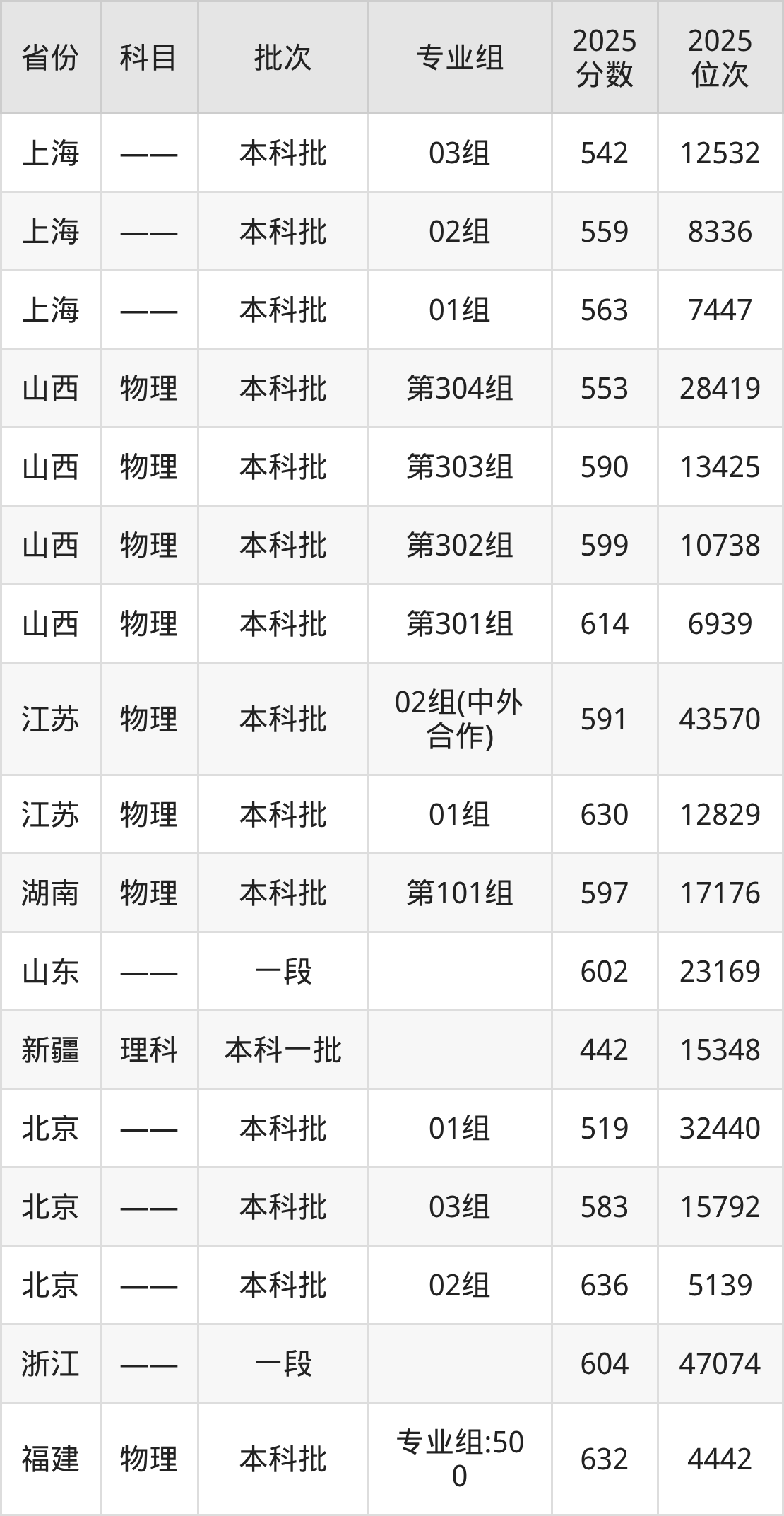 2025年在本科物理类进行招生,各专业组分数线详情如下: