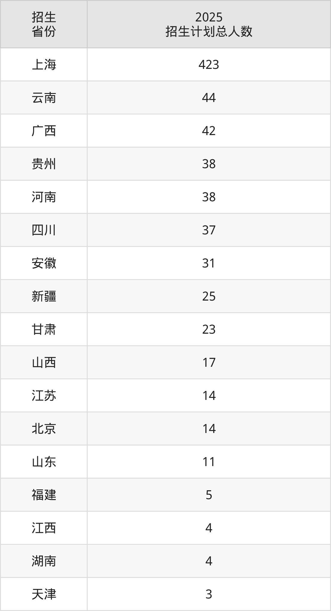 2025年上海中医药大学面向全国17个省市开展本科招生;招生专业共16个,招生人数共773人。2025年在上海市招生计划总人数是423人,其中,上海中医药大学在上海市招生人数最多的是护理学。上海中医药大学在各省具体招生人数情况如下表。
