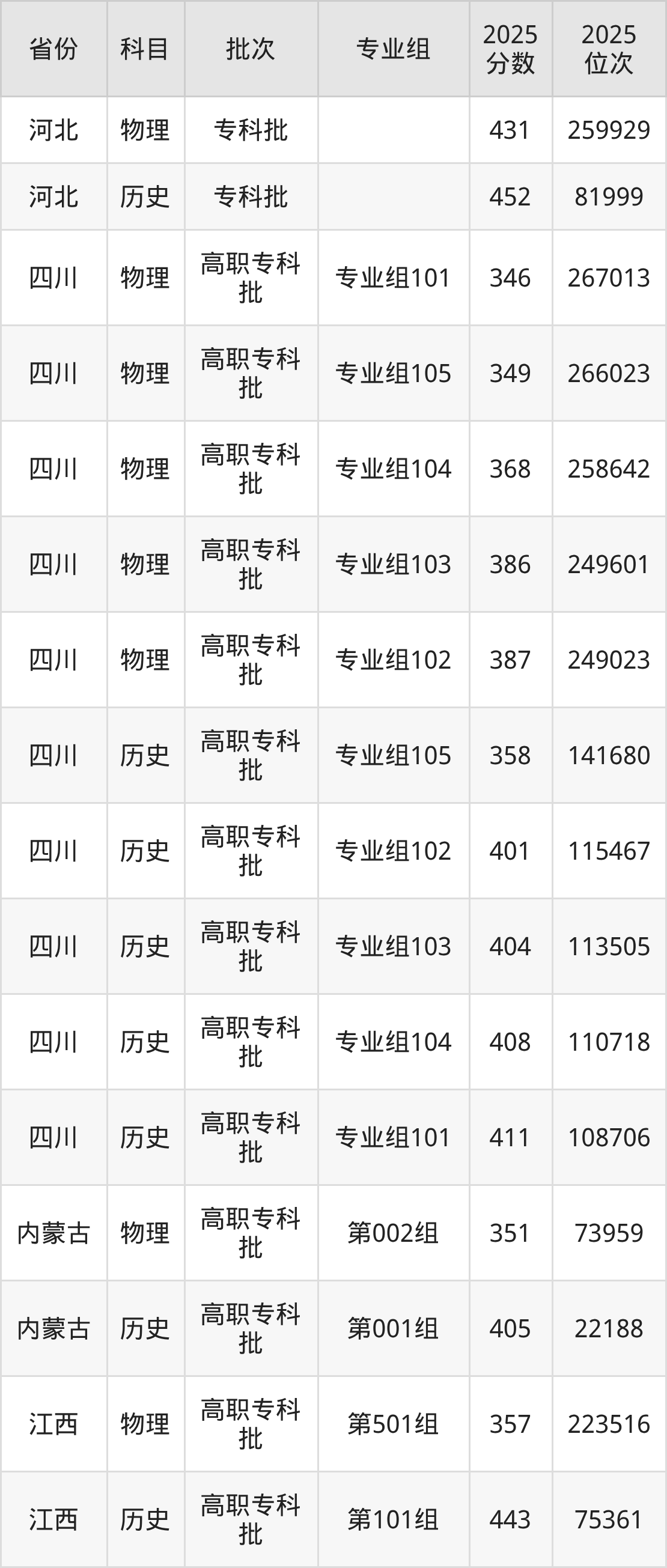 2025年重庆青年职业技术学院全国录取分数线是346分到460分,录取最低在四川物理类(专业组101)、录取最高在河北历史类。各省各专业组最低分具有差异,详情如下: