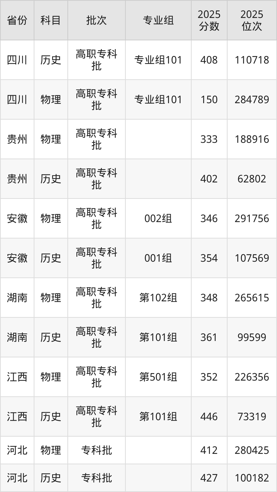2025年皖北卫生职业学院全国录取分数线是150分到453分,录取最低在四川物理类(专业组101)、录取最高在河北历史类。各省各专业组最低分具有差异,详情如下: