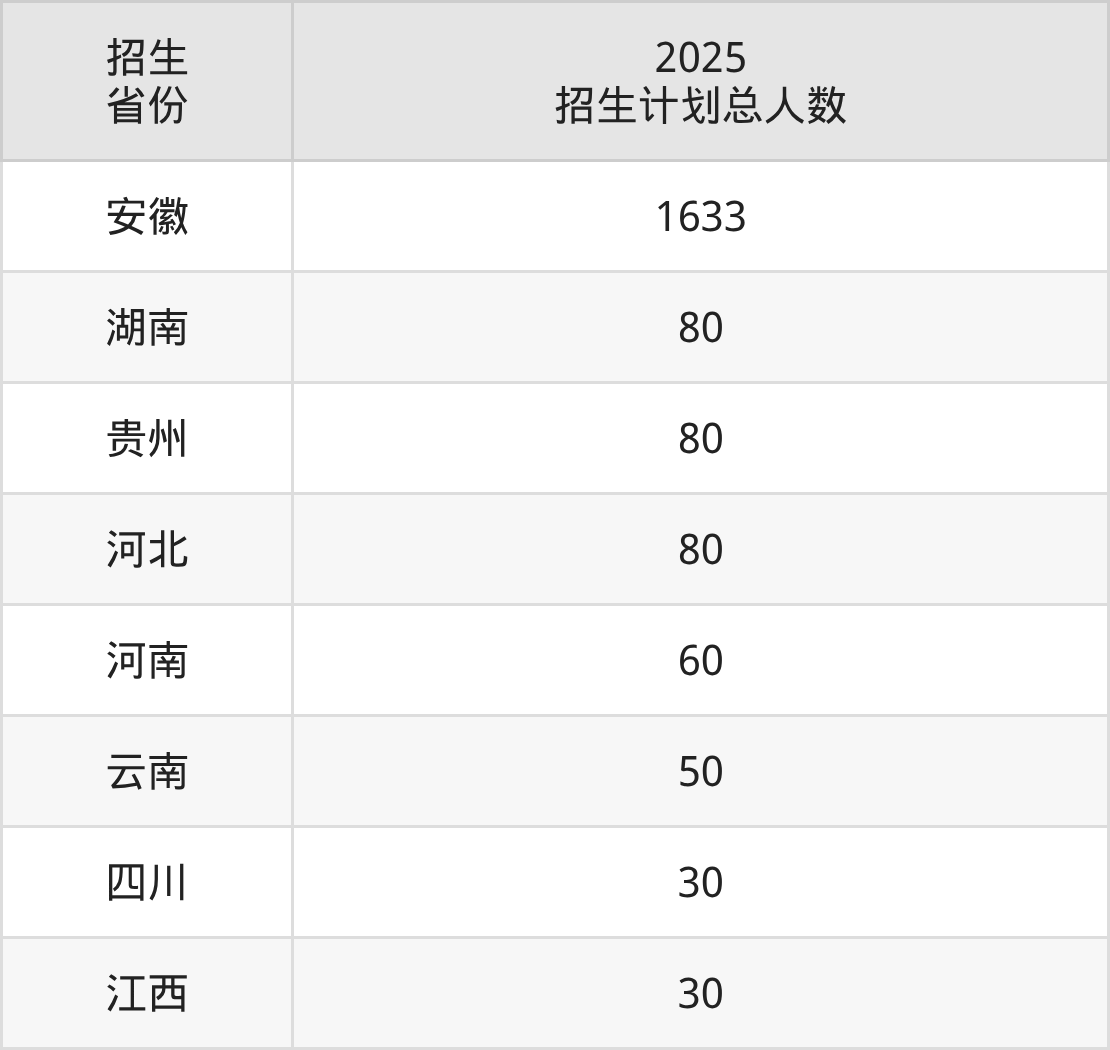 2025年皖北卫生职业学院面向全国8个省市开展专科招生;招生专业共15个,招生人数共2043人。2025年在安徽省招生计划总人数是1633人,其中,皖北卫生职业学院在安徽省招生人数最多的是临床医学。皖北卫生职业学院在各省具体招生人数情况如下表。