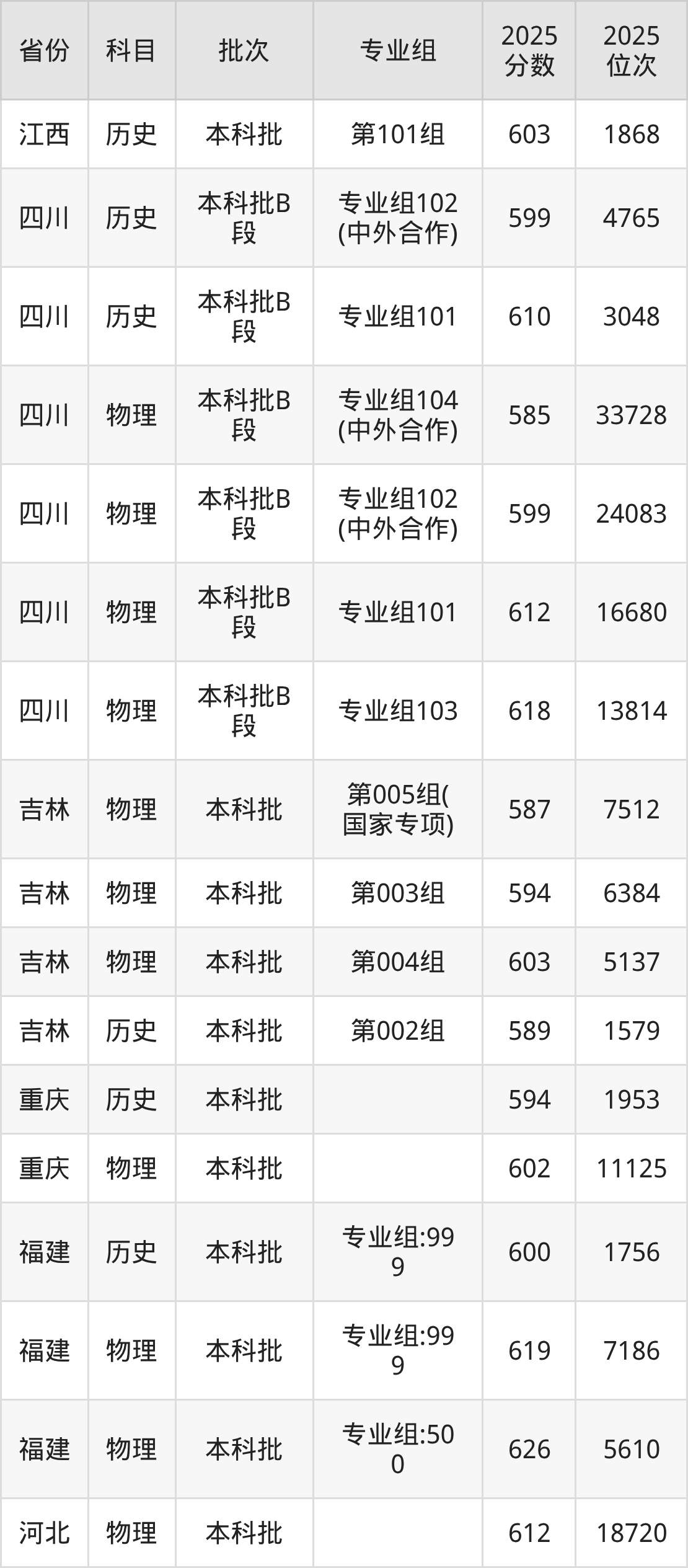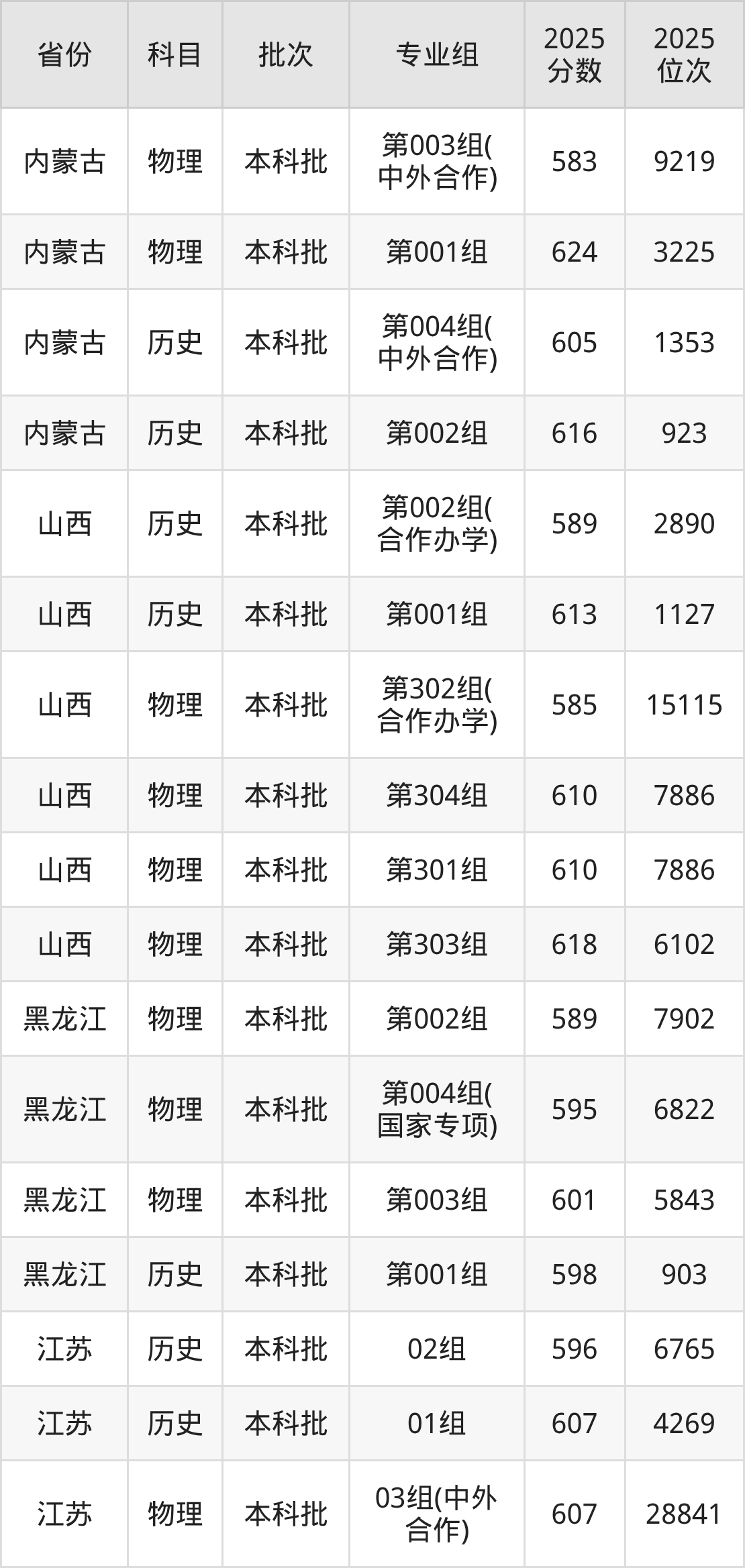 2025年在本科物理类进行招生,各专业组分数线详情如下: