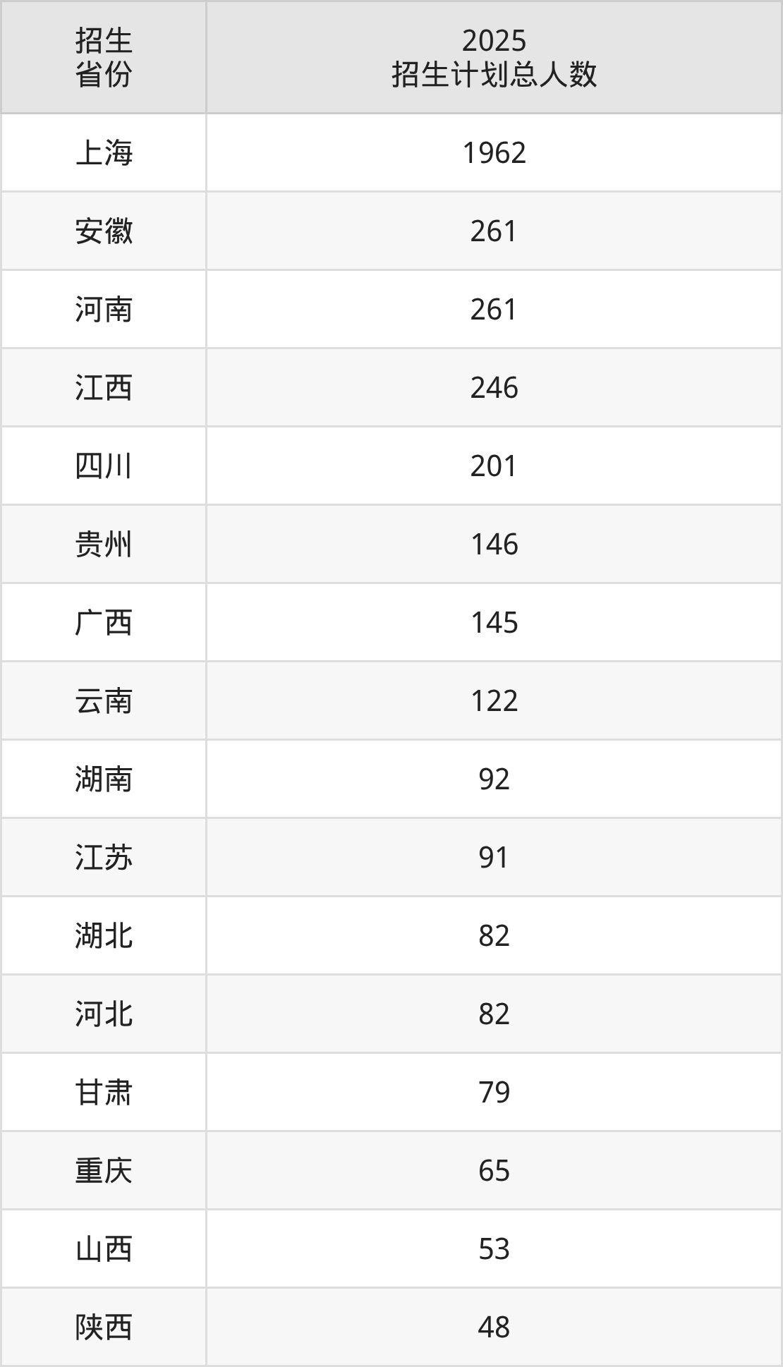 2025年上海大学面向全国26个省市开展本科招生;招生专业共41个,招生人数共4121人。2025年在上海市招生计划总人数是1962人,其中,上海大学在上海市招生人数最多的是电子信息类。上海大学在各省具体招生人数情况如下表。