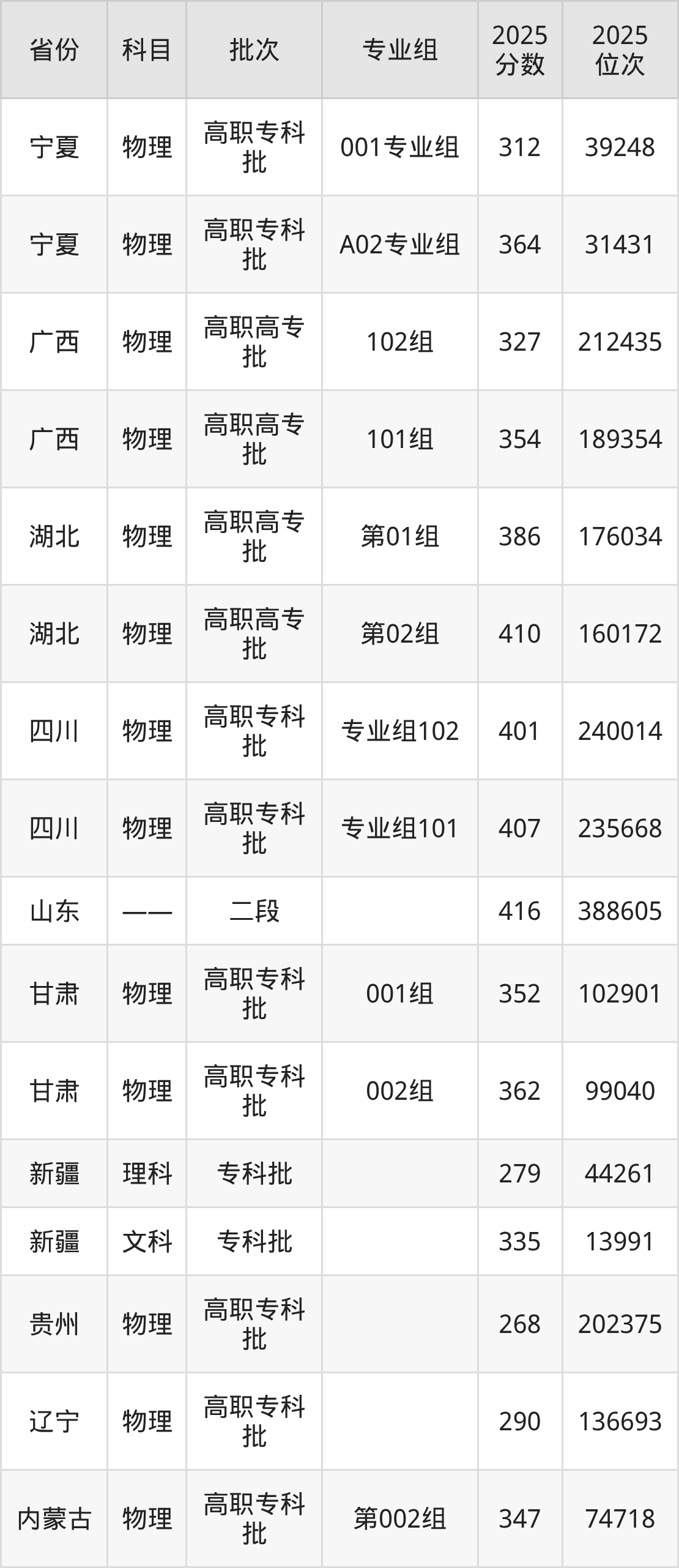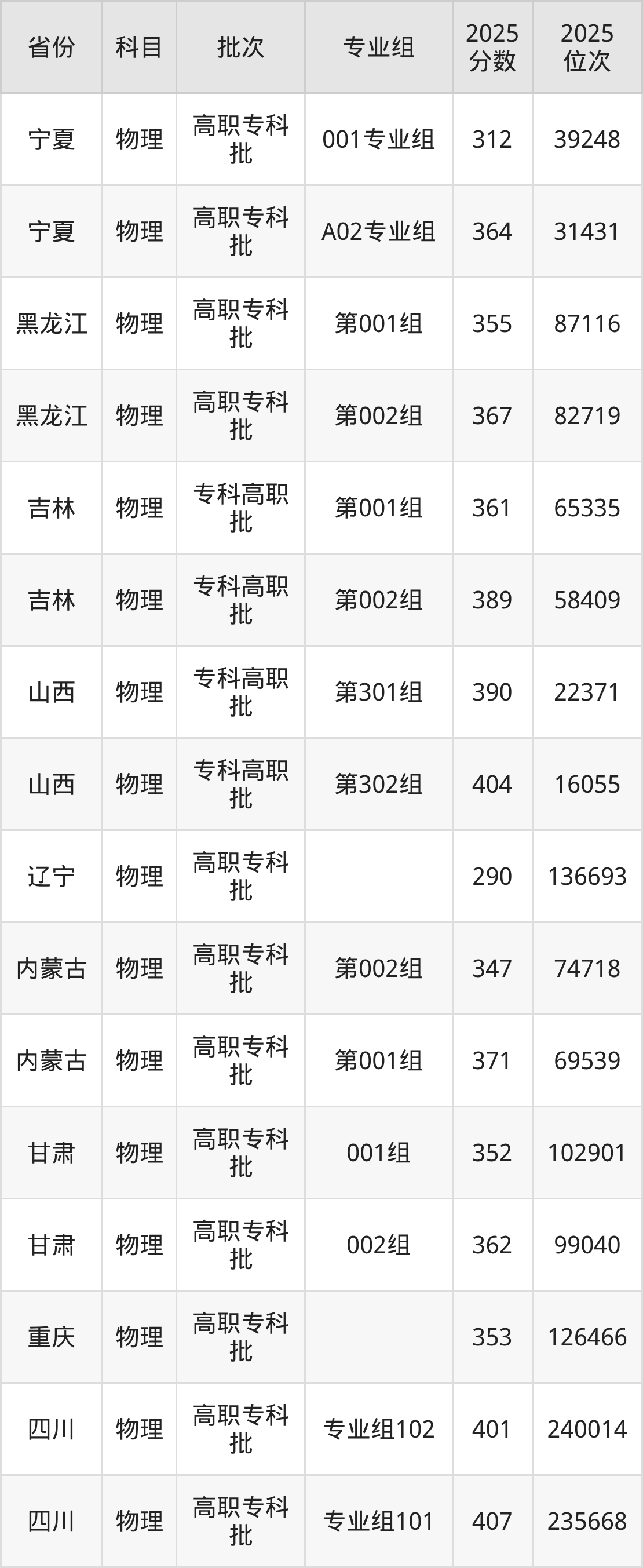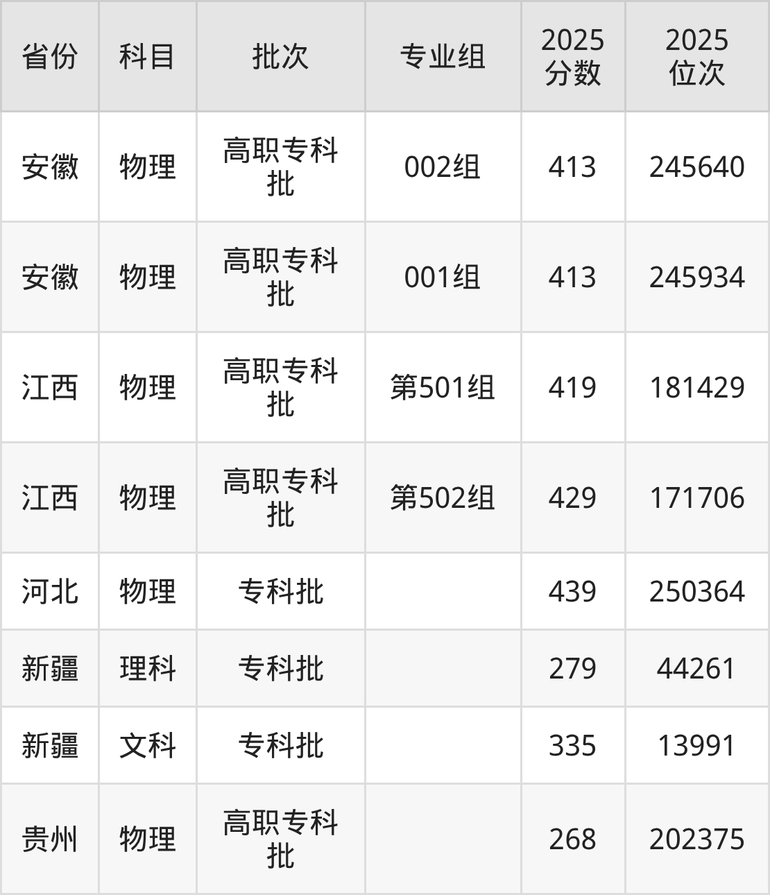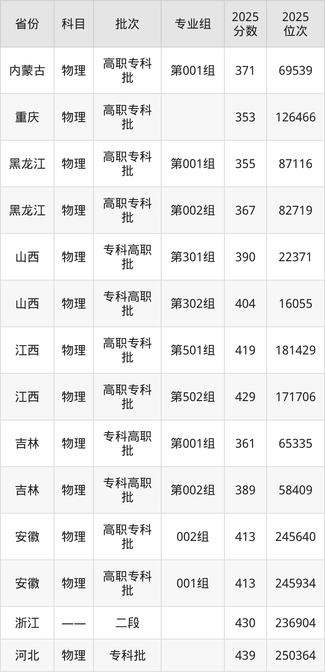 2025年在专科物理类进行招生,各专业组分数线详情如下: