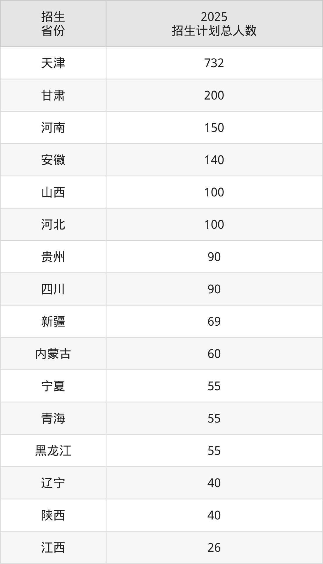 2025年天津医学高等专科学校面向全国21个省市开展专科招生;招生专业共22个,招生人数共2074人。2025年在天津市招生计划总人数是732人,其中,天津医学高等专科学校在天津市招生人数最多的是护理。天津医学高等专科学校在各省具体招生人数情况如下表。