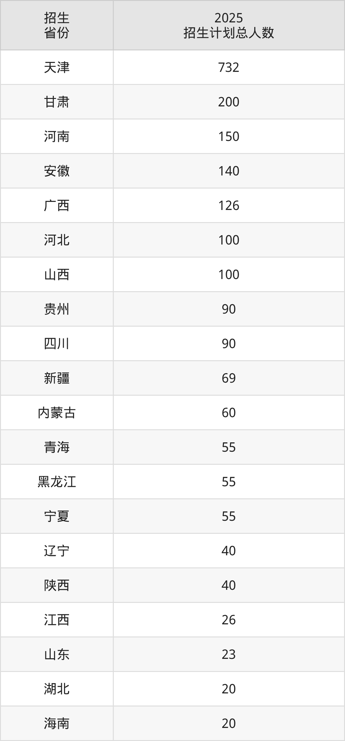 2025年天津医学高等专科学校面向全国24个省市开展专科招生;招生专业共22个,招生人数共2243人。2025年在天津市招生计划总人数是732人,其中,天津医学高等专科学校在天津市招生人数最多的是护理。天津医学高等专科学校在各省具体招生人数情况如下表。