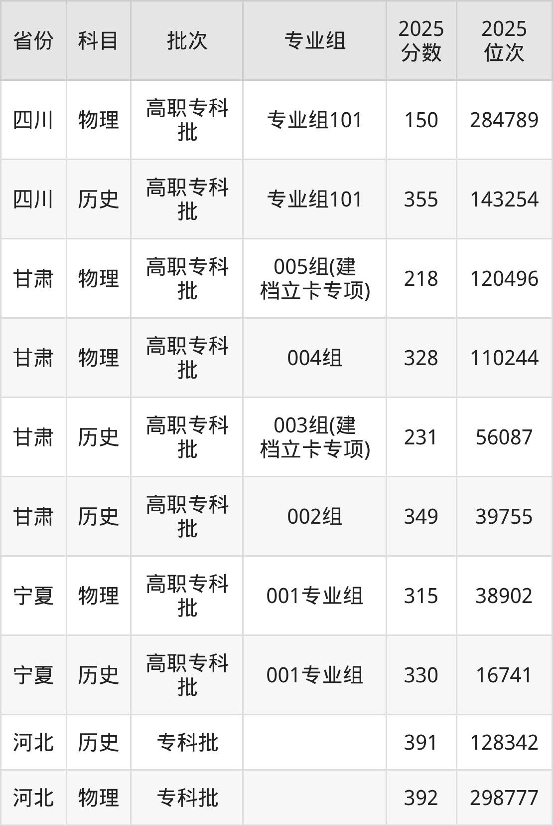 2025年甘肃农业职业技术学院全国录取分数线是150分到404分,录取最低在四川物理类(专业组101)、录取最高在河北物理类。各省各专业组最低分具有差异,详情如下: