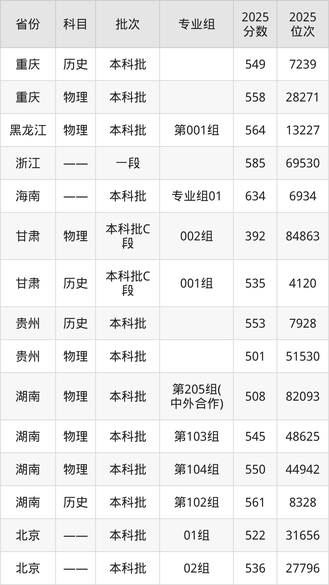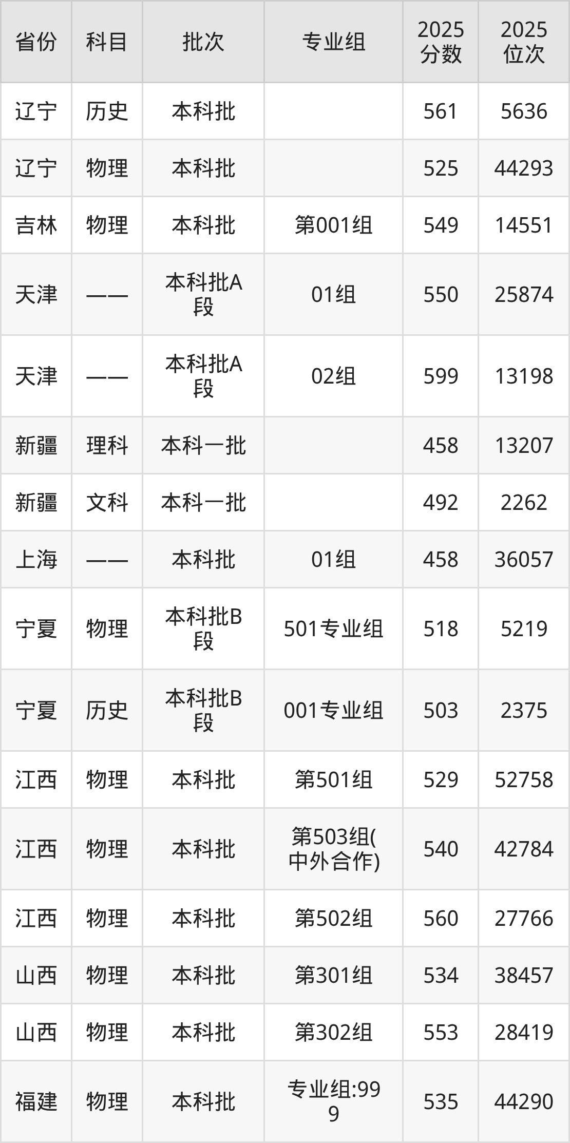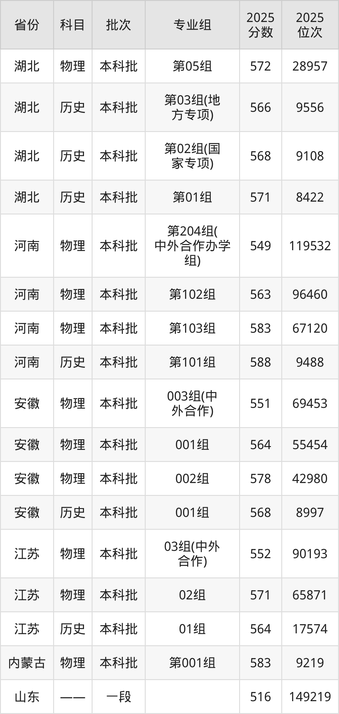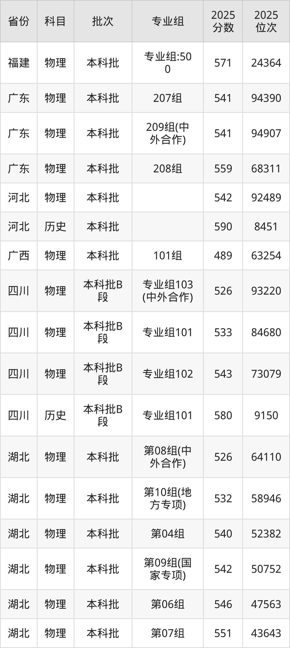 2025年在本科物理类进行招生,各专业组分数线详情如下: