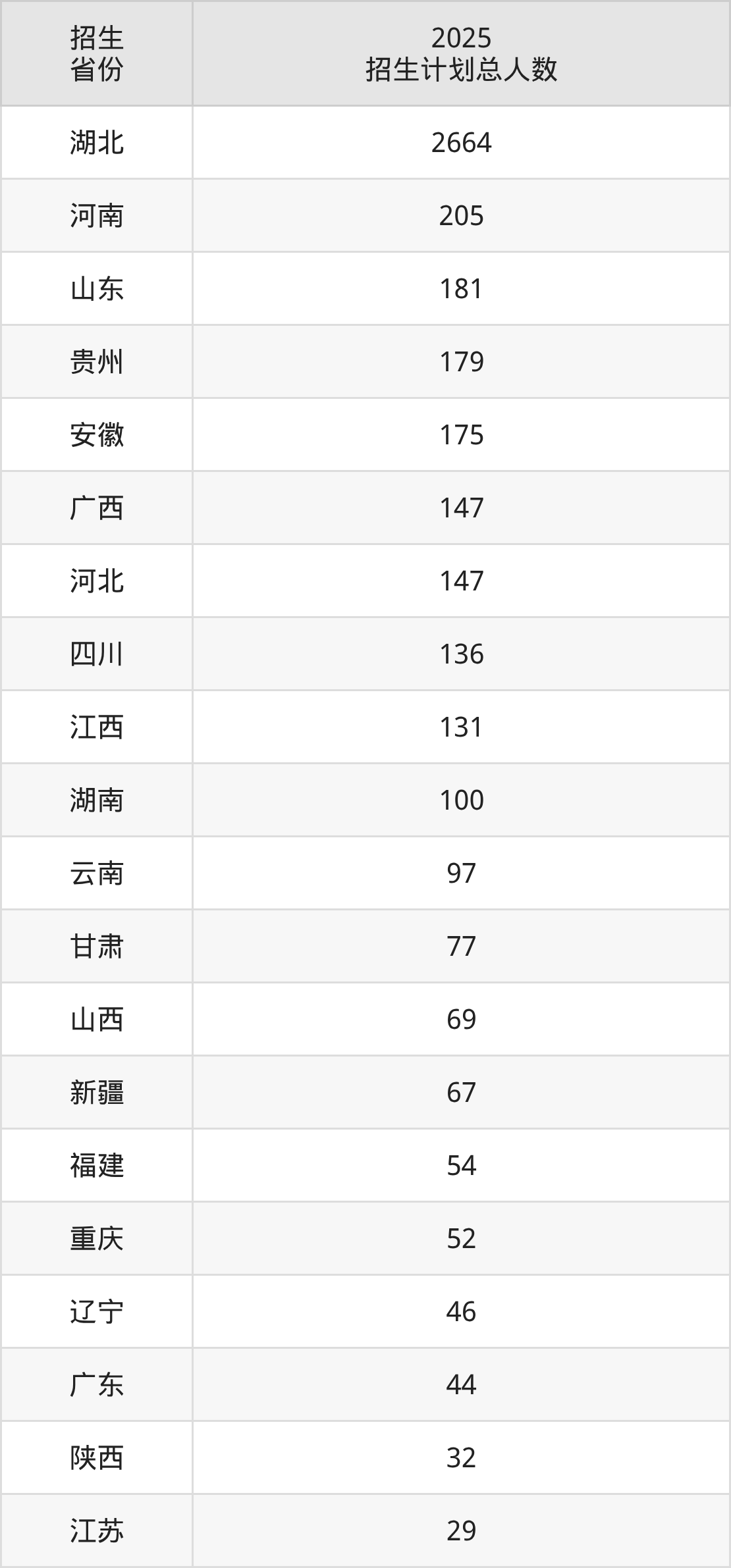 2025年武汉工程大学面向全国29个省市开展本科招生;招生专业共57个,招生人数共4735人。2025年在湖北省招生计划总人数是2664人,其中,武汉工程大学在湖北省招生人数最多的是计算机类。武汉工程大学在各省具体招生人数情况如下表。