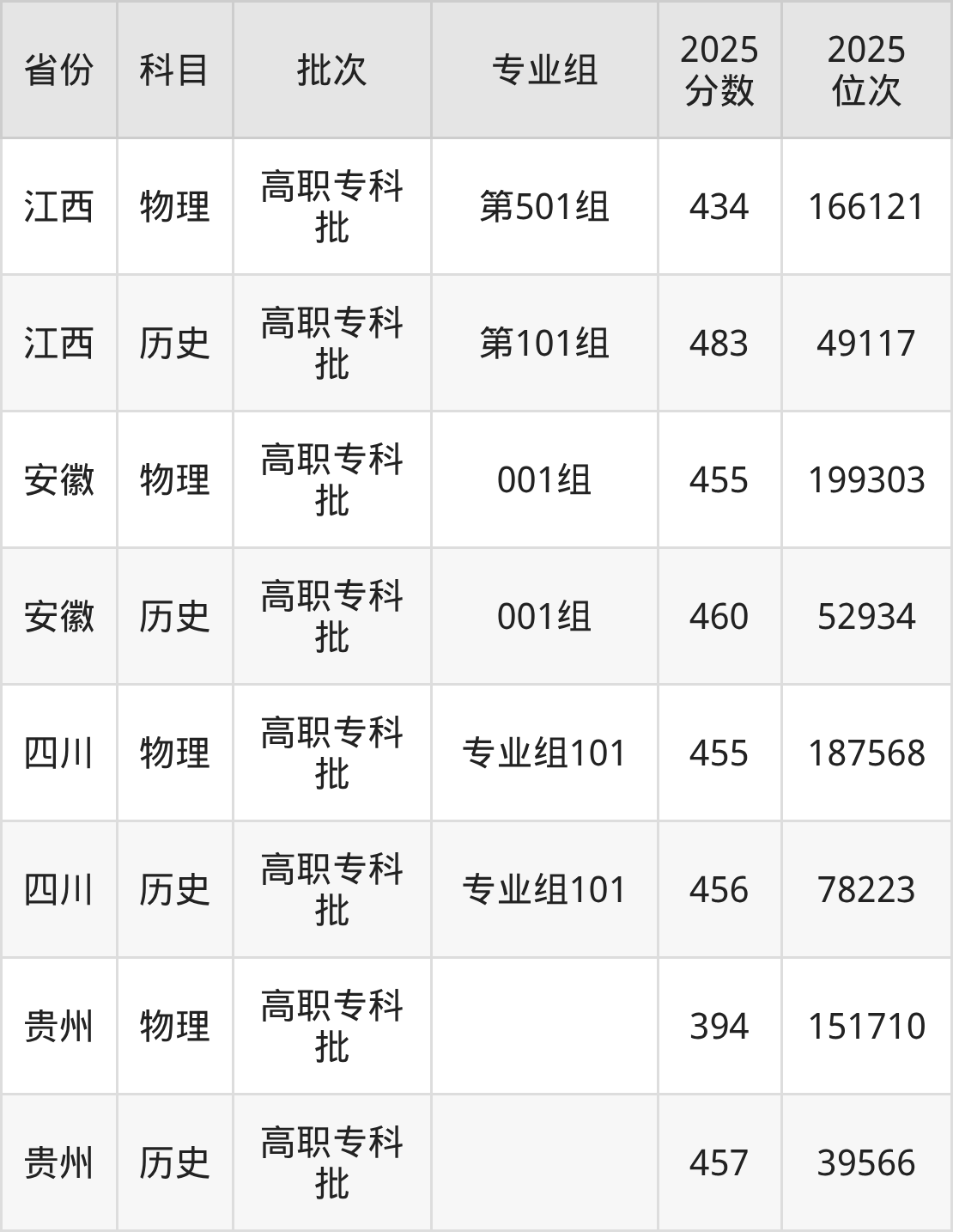 2025年杭州科技职业技术学院全国录取分数线是394分到483分,录取最低在贵州物理类、录取最高在江西历史类(第101组)。各省各专业组最低分具有差异,详情如下: