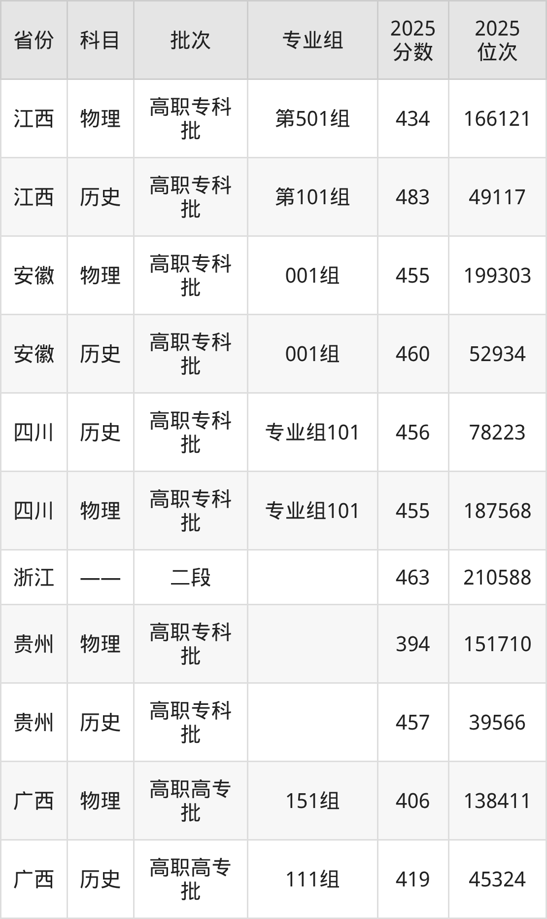 杭州科技职业技术学院001组:2025年投档录取最低分为455分,录取最低位次为199303名。