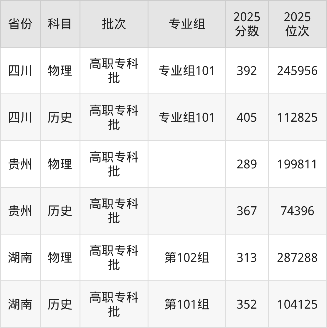 贵州建设职业技术学院专业组101:2025年投档录取最低分为392分,录取最低位次为245956名。