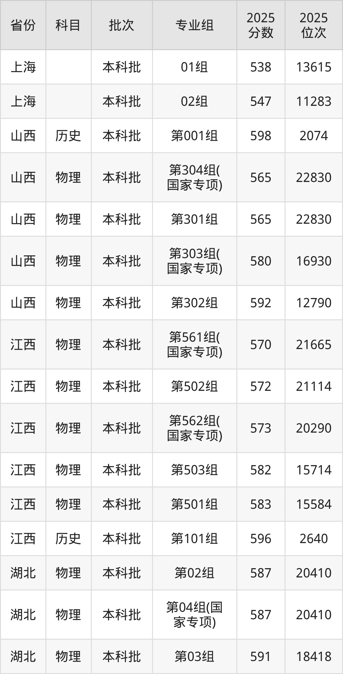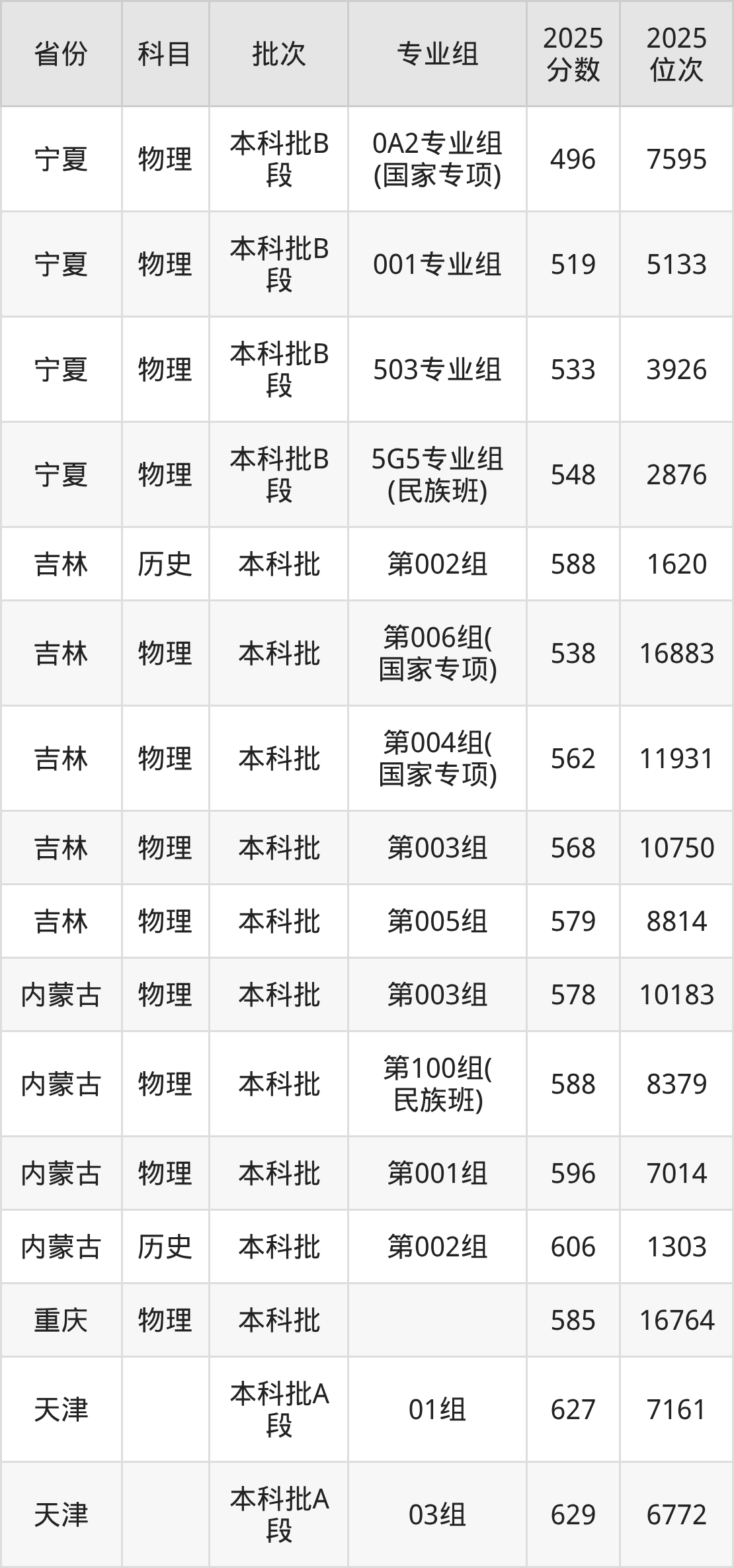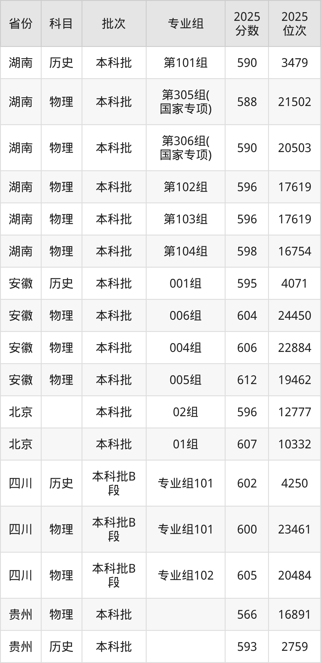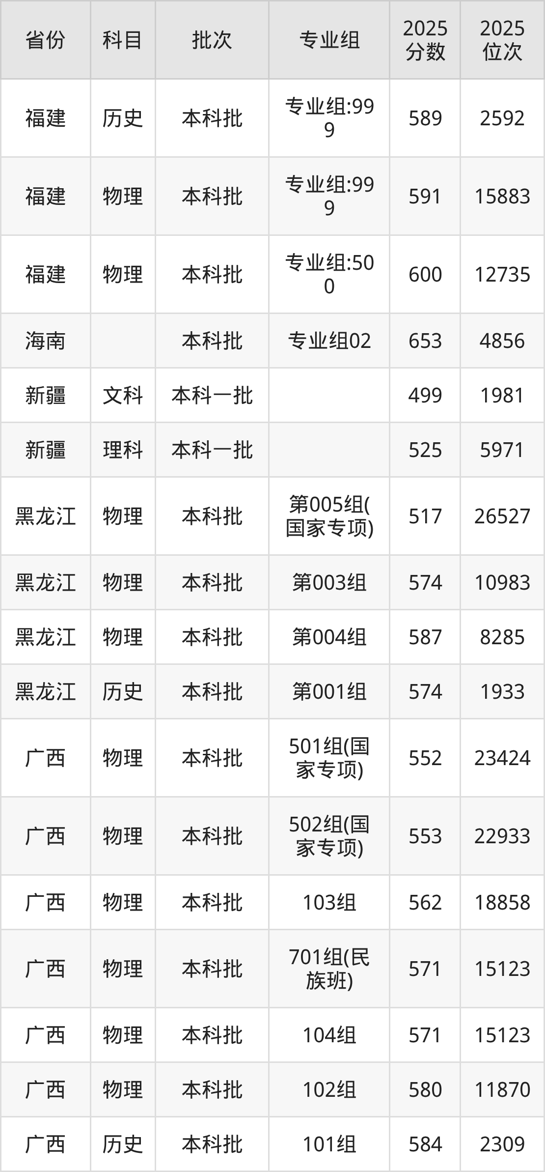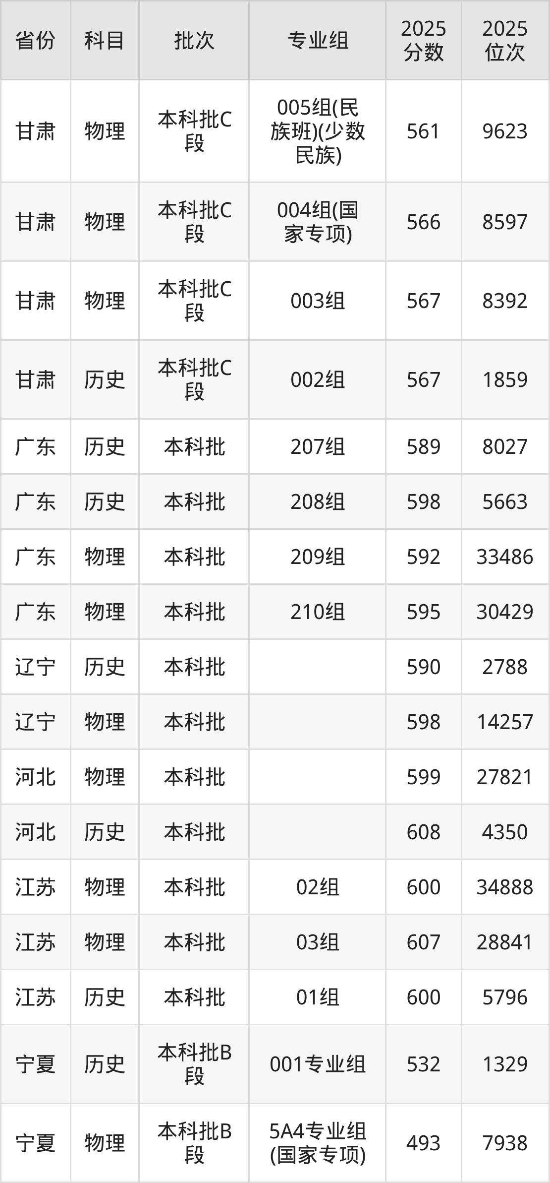 2025年在本科物理类进行招生,各专业组分数线详情如下: