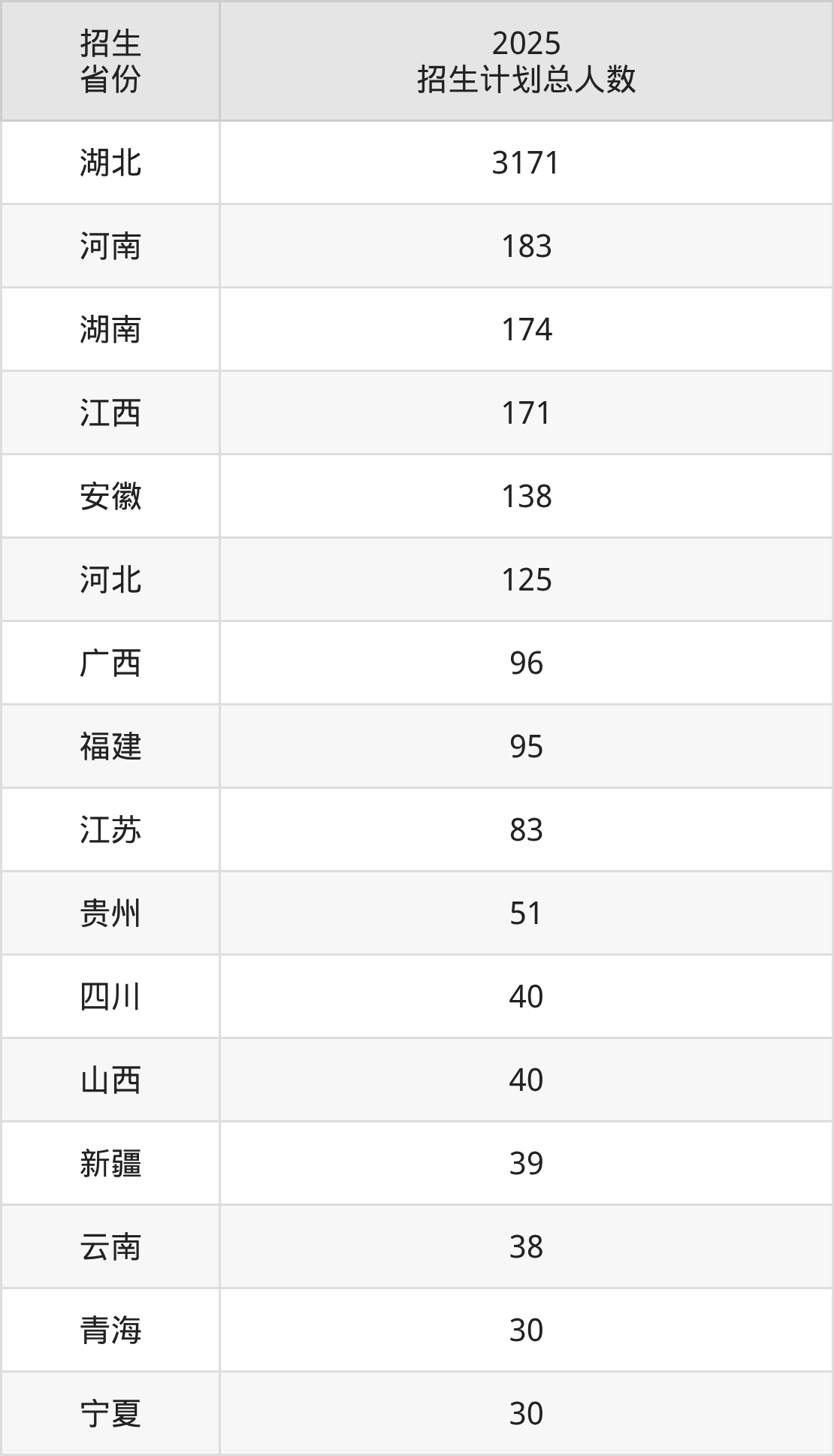 2025年文华学院面向全国25个省市开展本科招生;招生专业共32个,招生人数共3072人。2025年在湖北省招生计划总人数是3171人,其中,文华学院在湖北省招生人数最多的是计算机应用技术。文华学院在各省具体招生人数情况如下表。